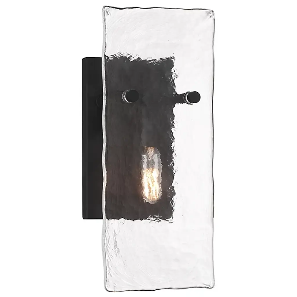 Collection: Genry, Material: Glass, Finish Color: Matte Black, Width: 5.5", Height: 13", Depth: 5.5", Backplate Width: 4.5", Backplate Length: 7.87", Lamping Type: Incandescent, Number Of Bulbs: 1, Wattage: 60 Watts, Dimmable: Yes, Moisture Rating: Damp Rated, Desc: Bring a beautiful ocean-inspired lighting look to your home with the Savoy House Genry 1-light sconce. It is decorated with a rippling pane of handmade glass and finished in Polished Nickel. Genry is 13" in height, 5.5" in width and extends 5.5" from the wall. It uses one candelabra size bulb of up to 60 watts. The bulb is not included. This sconce is damp area rated.,