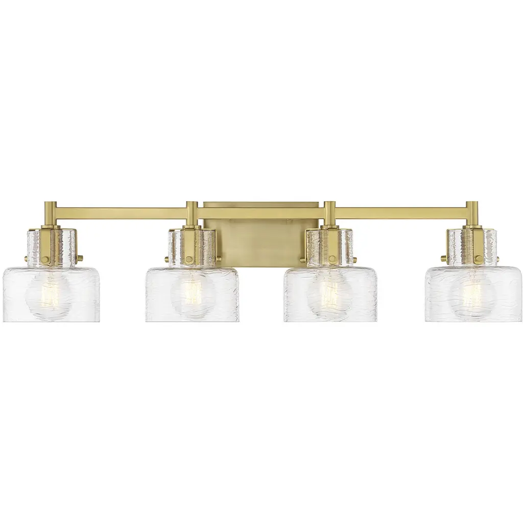 Collection: Genry, Material: Glass, Finish Color: Warm Brass, Width: 35", Height: 7.75", Depth: 5.5", Backplate Width: 4.5", Backplate Length: 7.87", Lamping Type: Incandescent, Number Of Bulbs: 4, Wattage: 60 Watts, Dimmable: Yes, Moisture Rating: Damp Rated, Desc: Bring a beautiful ocean-inspired lighting look to your home with the Savoy House Genry 4-light bath bar. It is decorated with rippling panes of handmade glass and finished in Polished Nickel. Genry is 7.75" in height, 35" in width and extends 5.5" from the wall. It uses four candelabra size bulbs of up to 60 watts per bulb. Bulbs not included. This bath light is damp area rated and must be installed as shown.,