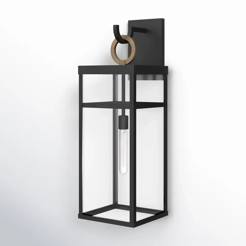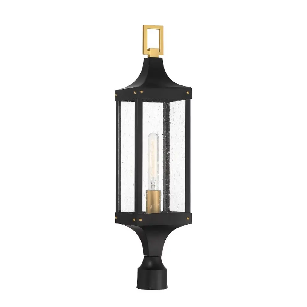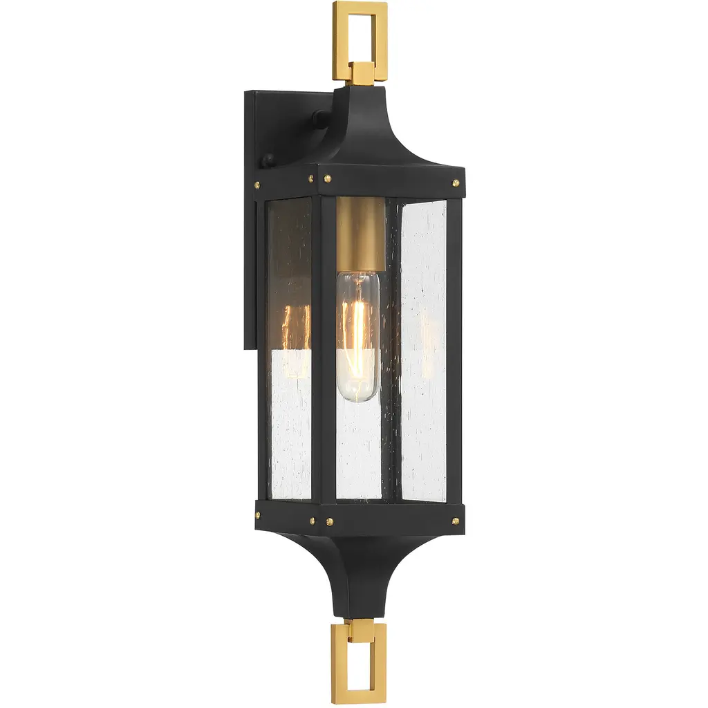 Collection: Glendale, Material: Glass, Finish Color: Matte Black/Weathered Brushed Brass, Width: 5.75", Height: 24.5", Depth: 7", Backplate Width: 6", Backplate Length: 10", Lamping Type: Incandescent, Number Of Bulbs: 1, Wattage: 60 Watts, Dimmable: Yes, Moisture Rating: Wet Rated, Desc: Featuring a handsomely constructed look that recalls designer jewelry, the Savoy House Glendale 1-light outdoor wall lantern effortlessly emboldens any outdoor space. Buckle and screw detailing is finished in Weathered Brushed Brass to contrast beautifully with the Matte Black finish. Clear seeded glass adds texture and drama. Glendale is 24.5" in height, 5.75" in width and extends 7" from the wall. Uses one standard size bulb of up to 60 watts. The bulb is not included. Wet area rated.,
