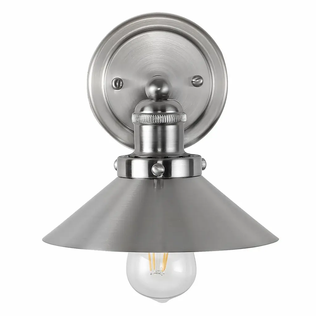 Set a dramatic mood with the Glenn wall sconce. Whether you want the industrial-inspired chic of an old noir film, or the simple serenity of a country homestead novel, this fixture perfectly creates a classic scene right in your own home. The uncluttered details of the arm hardware and conical metal shade are an ideal fit for transitional, modern vintage, urban farmhouse, industrial, or loft-like decor styles. A high-quality brushed satin nickel finish looks terrific now, and for years to come. The fixture is 7” wide by 12” high and holds a 60W E-style bulb. Plus, it’s adjustable: you can tilt the shade to place the light exactly where you want it. You’ll love the way this sconce’s subtle sophistication and streamlined casual style sets the stage in your living space.