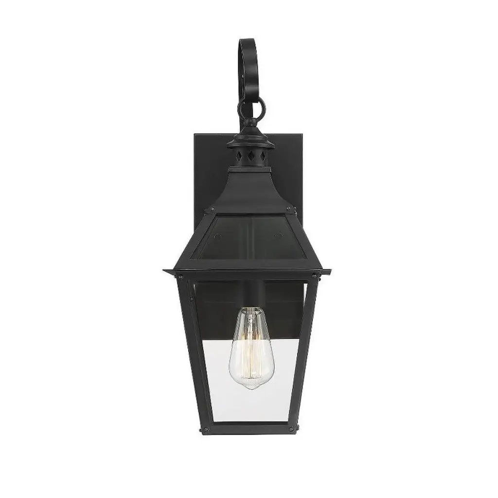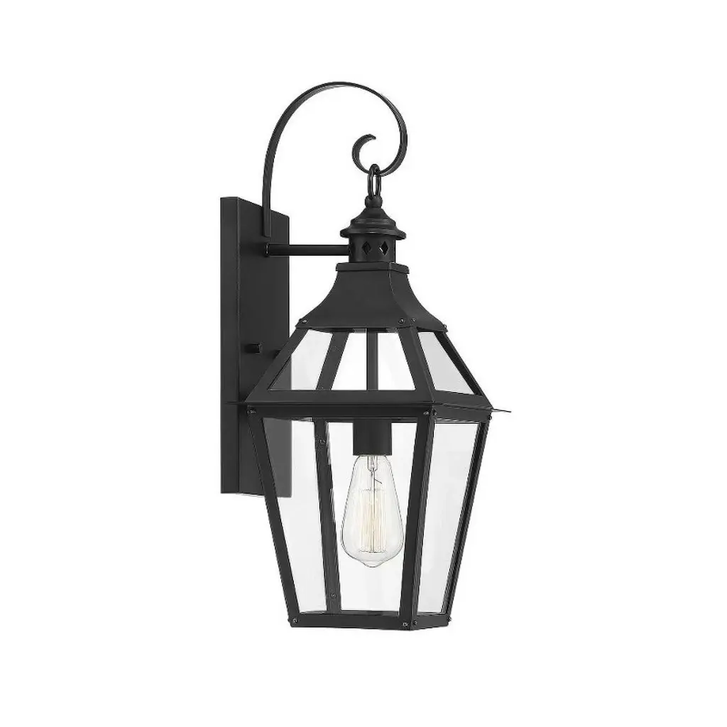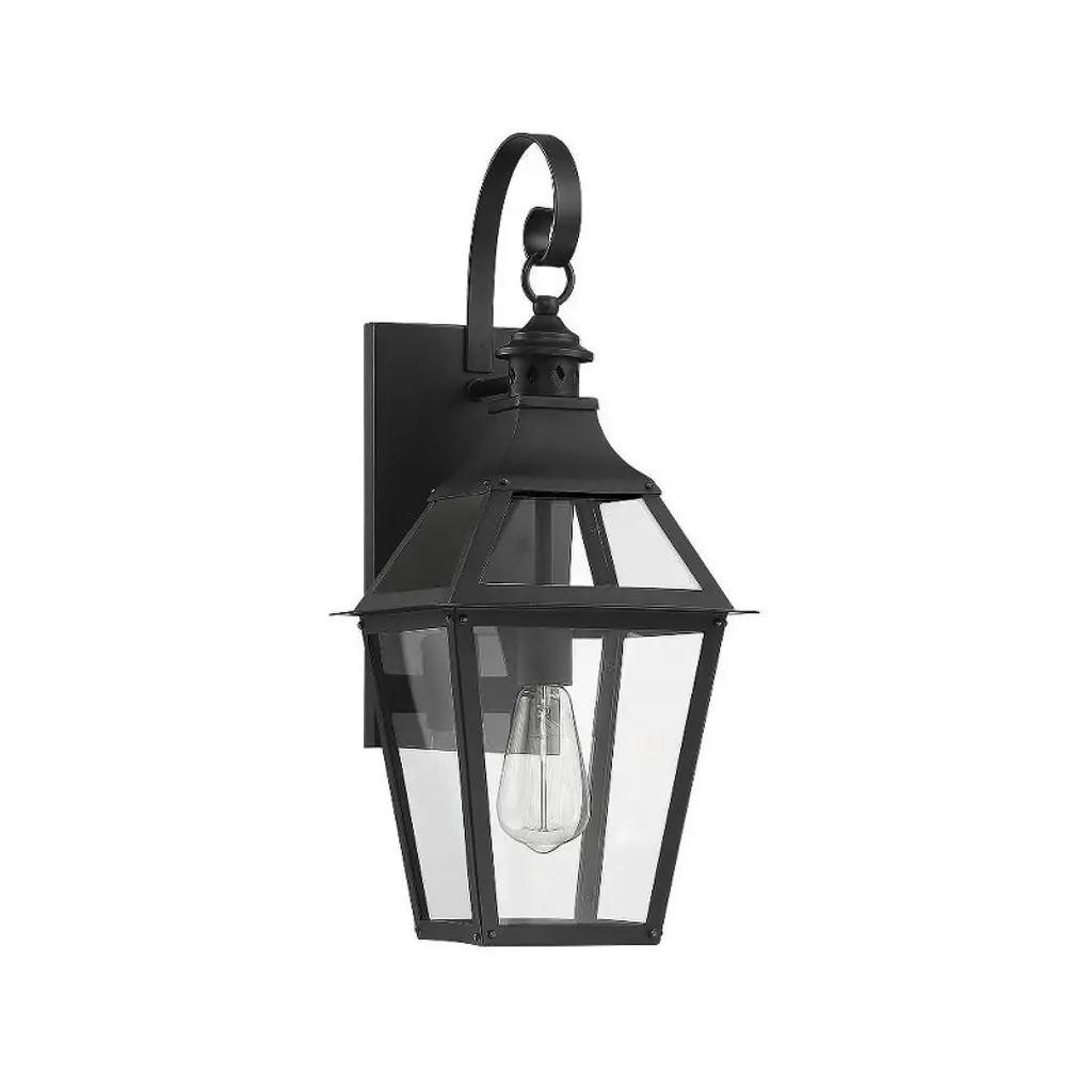 This Savoy House Jackson 1-light outdoor wall lantern is the perfect way to easily boost your home’s curb appeal. It is crafted in a classic, timeless style with boldly angled curves, eye-catching pierced metal detail and a dramatic shepherd’s hook. Panes of clear glass ensure a bright, beautiful glow and a generously sized backplate will help to cover any holes left from replacing previous fixtures. Jackson is finished in black with gold highlights to go well with anything and add a touch of glamour. Use this lantern beside your front and side doors or above your garage door. This fixture is 9" wide and 22.38" tall. It extends 9.88" from the wall. Uses a standard size bulb of up to 60 watts (not included).