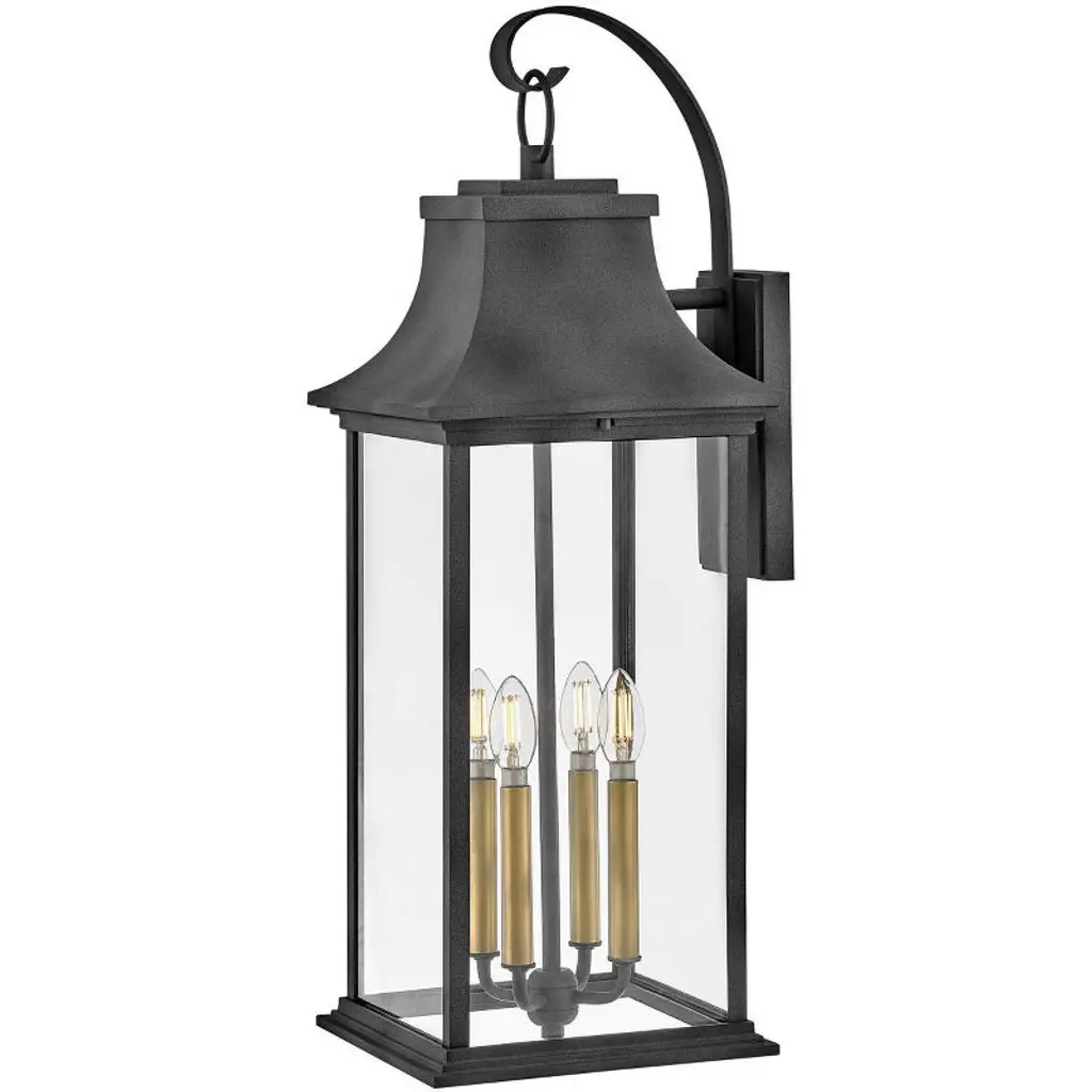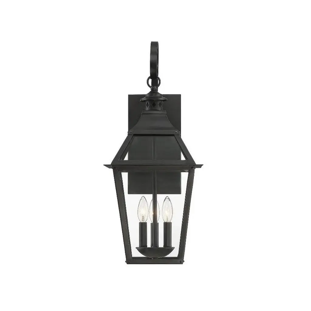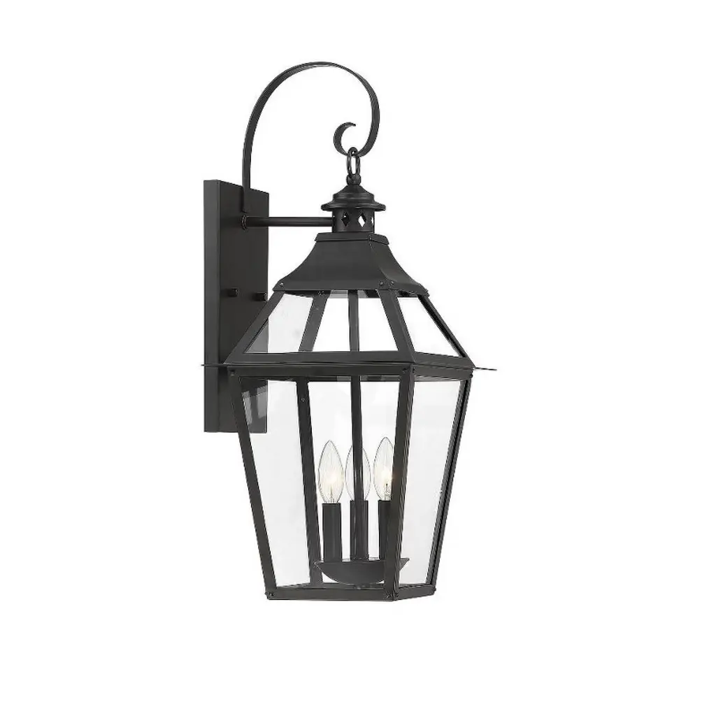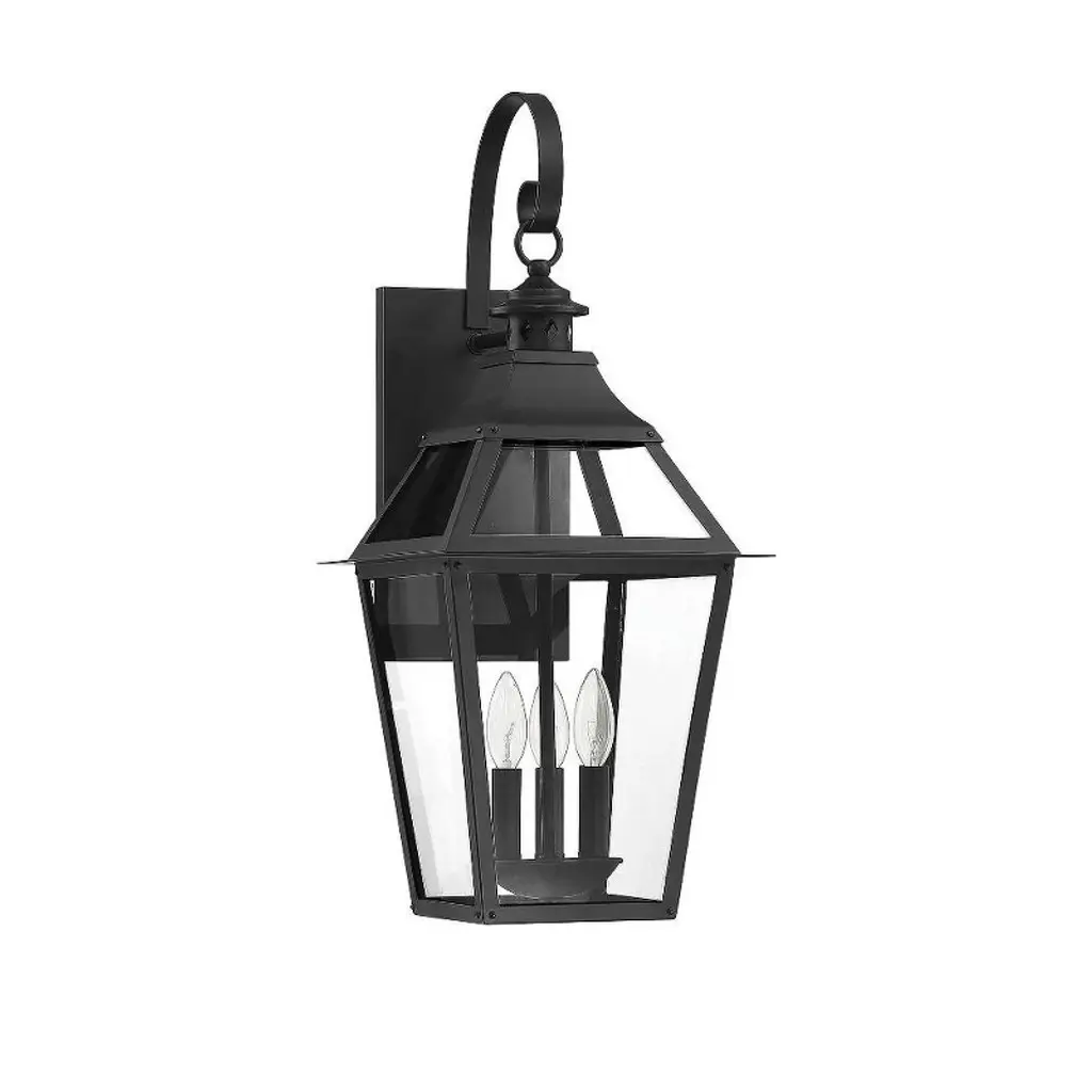 This Savoy House Jackson 3-light outdoor wall lantern is the perfect way to easily boost your home’s curb appeal. It is crafted in a classic, timeless style with boldly angled curves, eye-catching pierced metal detail and a dramatic shepherd’s hook. Panes of clear glass ensure a bright, beautiful glow and a generously sized backplate will help to cover any holes left from replacing previous fixtures. Jackson is finished in black with gold highlights to go well with anything and add a touch of glamour. Use this lantern beside your front and side doors or above your garage door. This fixture is 10.88" wide and 25.5" tall. It extends 11.75" from the wall. Uses 3 candelabra size bulbs of up to 40 watts each (not included).