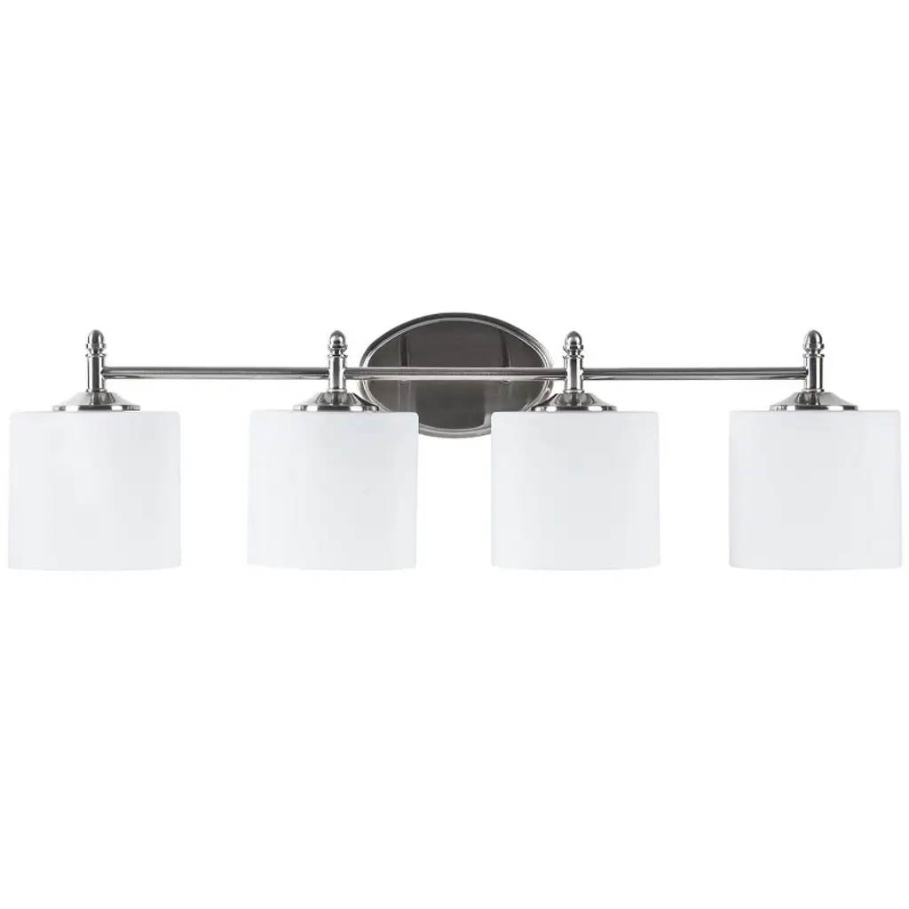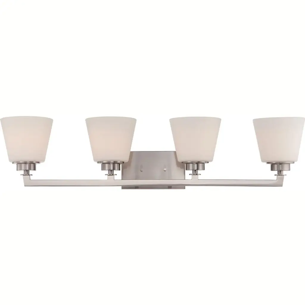 Flattering light? Check. Stylish appearance? Check. The Kane bath bar has all the requirements for terrific bath lighting. The oval wall plate, straight light arm bar, and chunky, curved shade holders have streamlined detailing, highlighted by a brushed, satin nickel finish. The color of the frame is a wonderful complement to the splendid white, etched glass shades. Inside each of these four rectangular shades is a 60W, E-style bulb: ample soft light, filtered through the white glass, makes everyone feel comfortable. This fixture is 33” wide, UL rated for damp locations, and may be mounted as uplight or downlight. The Kane makes the task of choosing a beautiful, high style light fixture for your bathroom or powder room, easy to complete!
