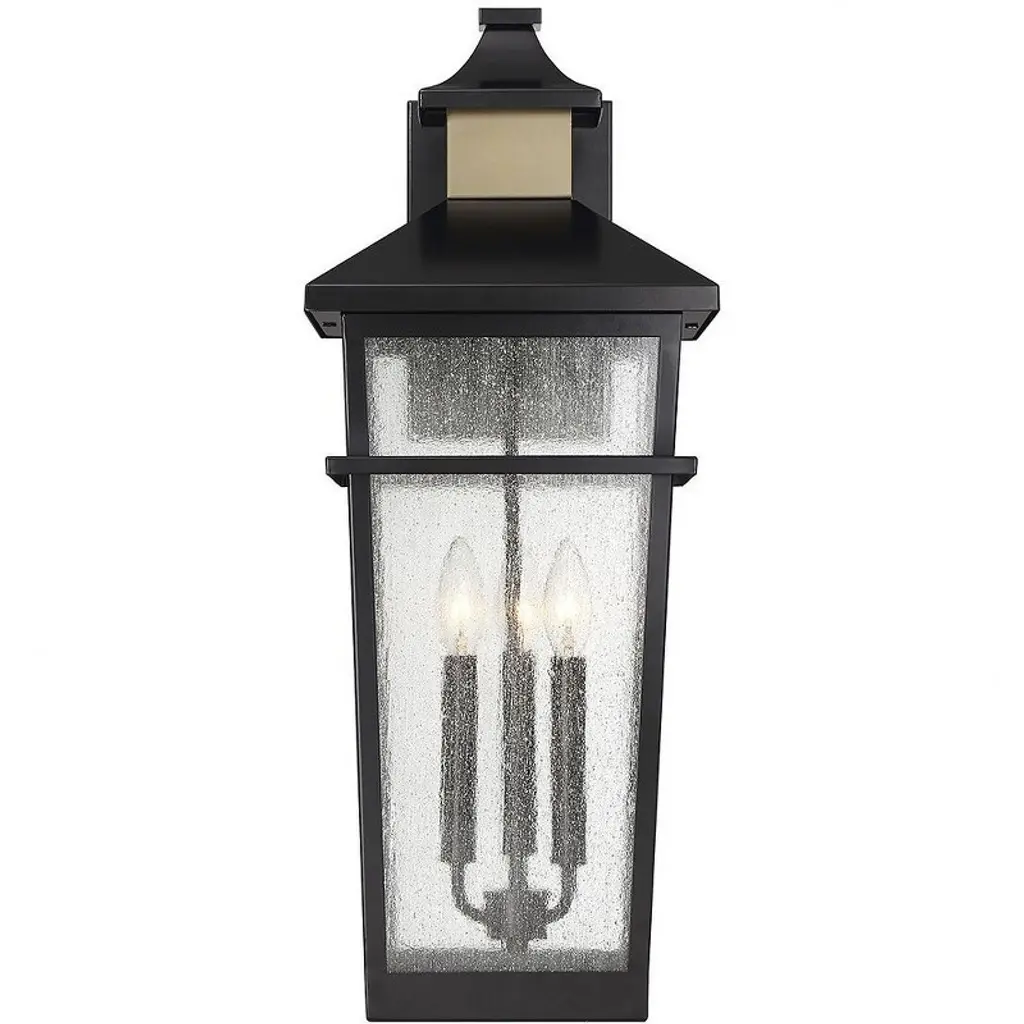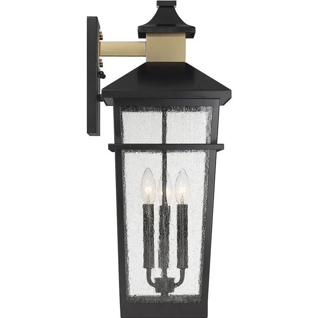This Savoy House Kingsley 3-light outdoor wall light has a coastal-inspired lantern style with highly fashionable touches. Panes of seedy glass are accentuated by a matte black finish with brass detailing at the backplate and hood. Kingsley is 25.25" in height, 10" in width and extends 11.50" from the wall. It uses 3 candelabra size bulbs of up to 40 watts per bulb (bulbs not included).