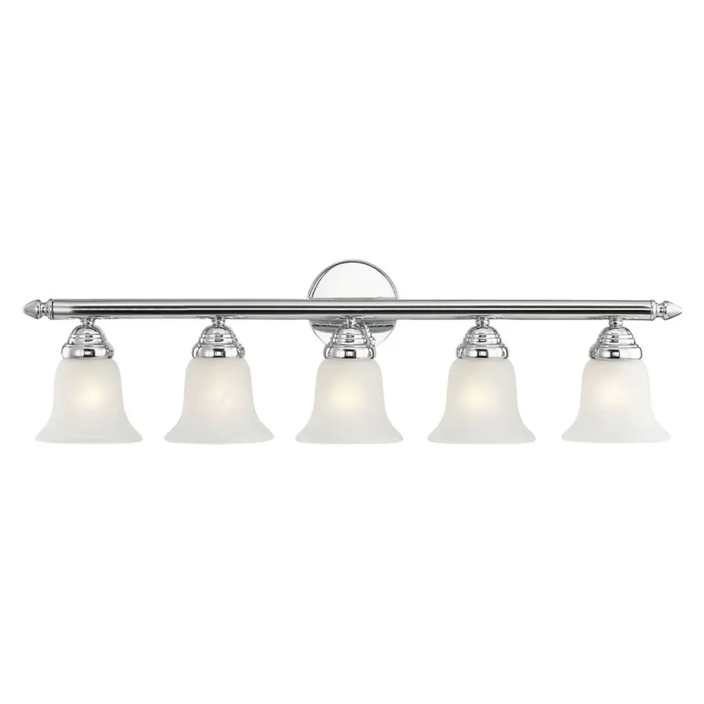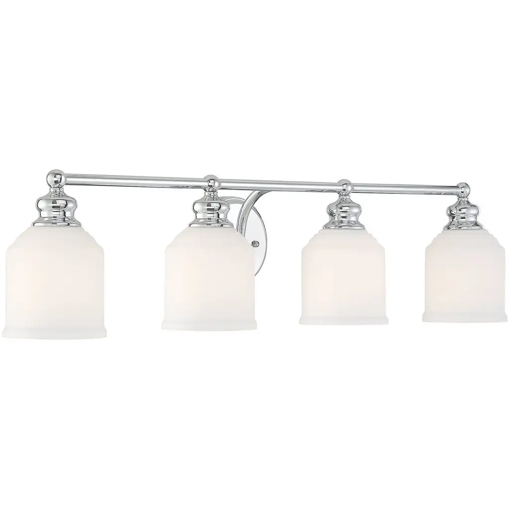 From Savoy House, the Melrose 4-light bath vanity bar stylishly updates classic Americana design for today's interiors. It features modern lines, white opal glass shades and a polished chrome finish. It may be mounted as either uplight or downlight. Bath bar lights are a classic choice for illuminating vanity mirrors in bathrooms big and small. The polished chrome finish can be paired with chrome hardware or mixed with hardware in other finishes. Bring Melrose into bathrooms of traditional, transitional or classic style to improve the look and the lighting. When you choose a Savoy House lighting fixture, you can be certain you’ve selected a piece that will withstand the test of time.