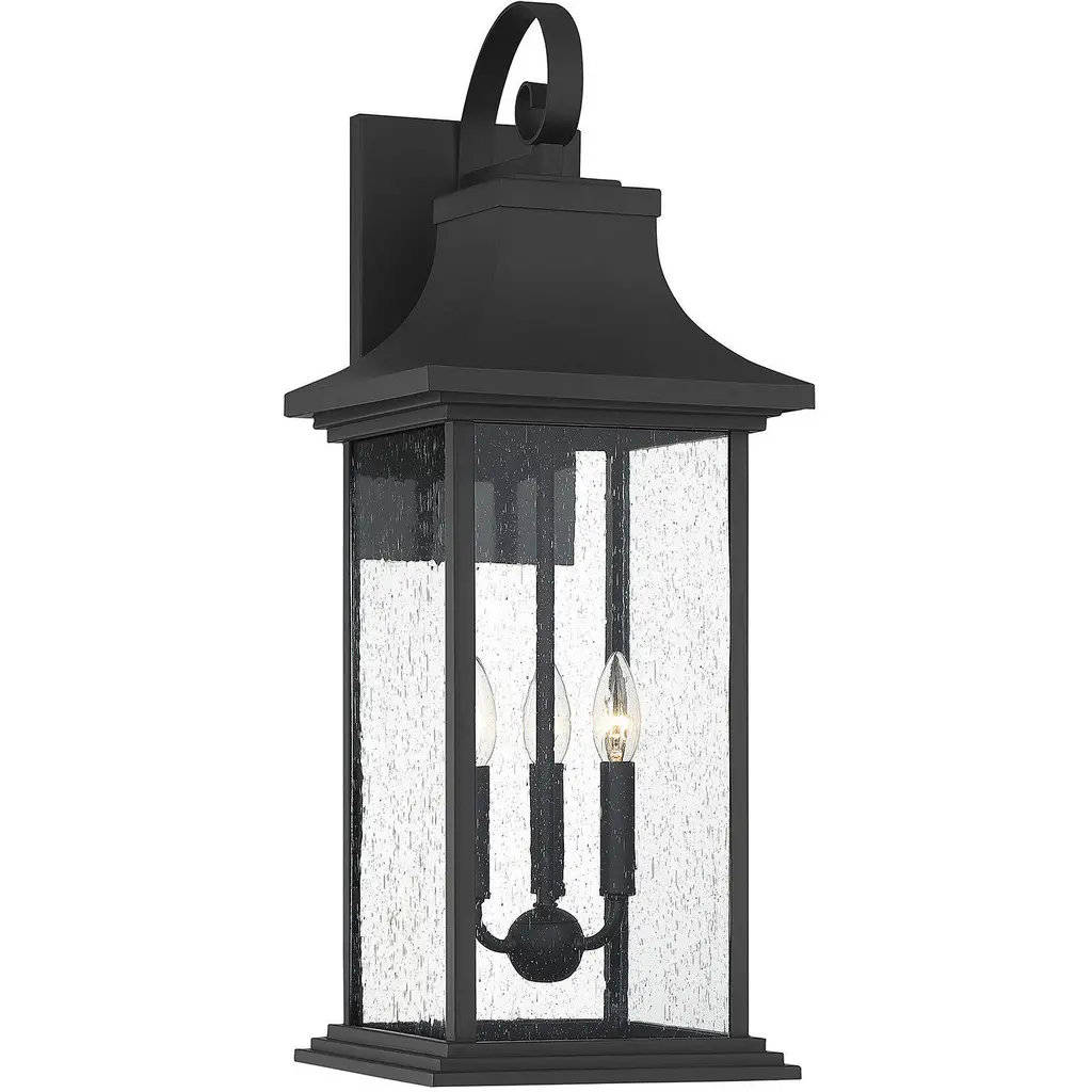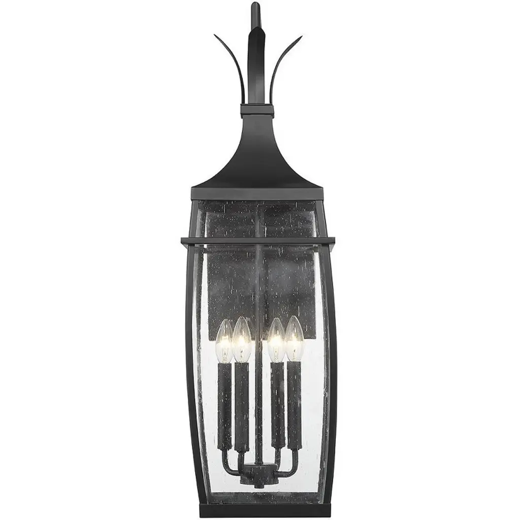 A hint of nature-inspired detailing decorates the top of this Savoy House Montpelier 4-light outdoor wall light. Its slightly curved structure features panes of clear seeded glass and is finished in a classic matte black. Montpelier is 32" in height, 9.50" in width and extends 12" from the wall. It uses 4 candelabra size bulbs with a max of 40 watts per bulb (bulbs not included).