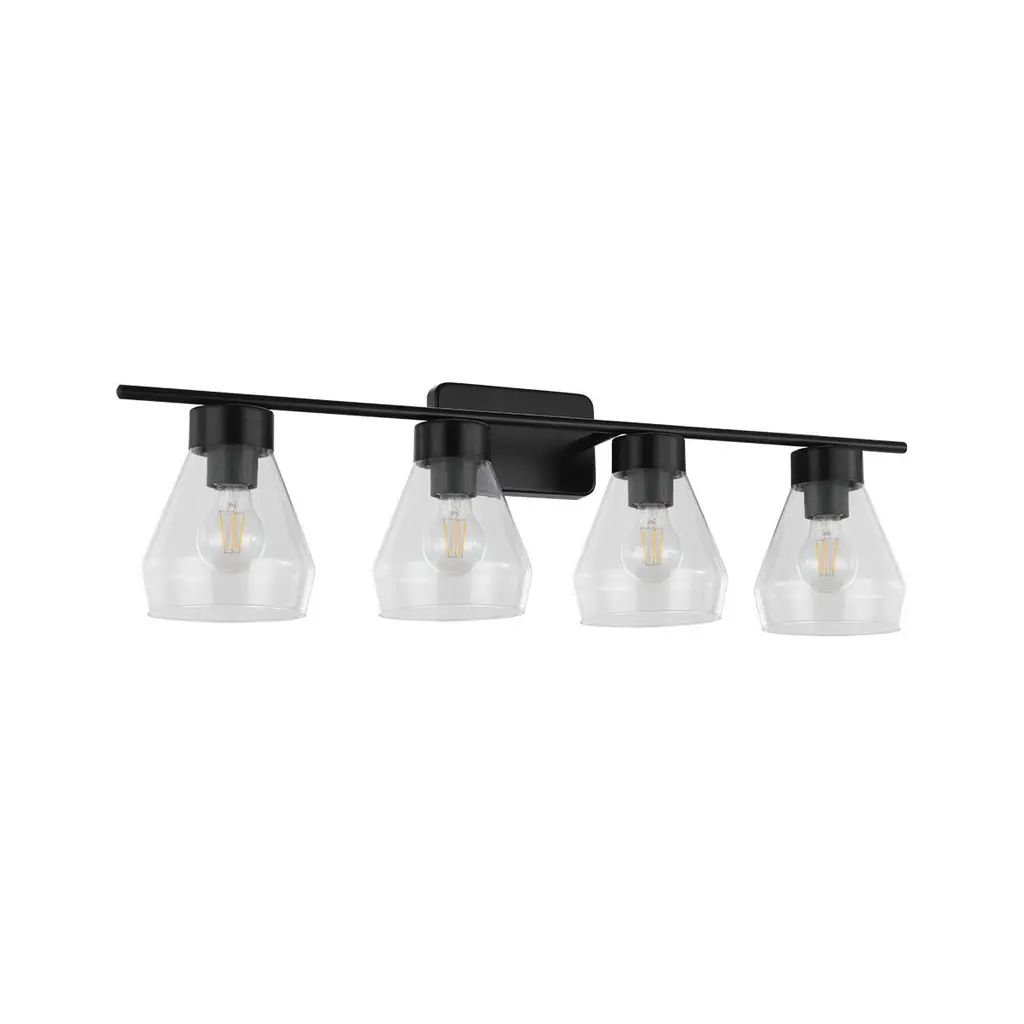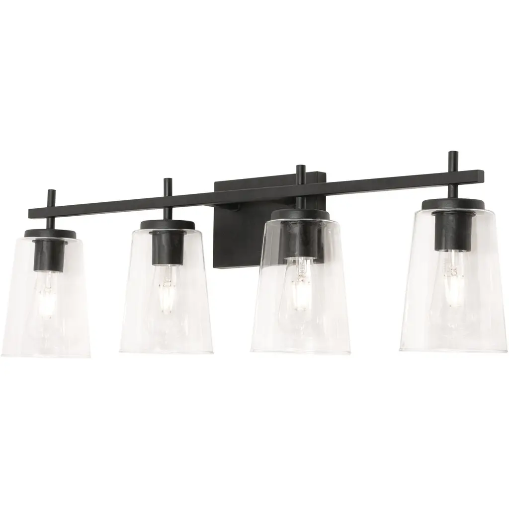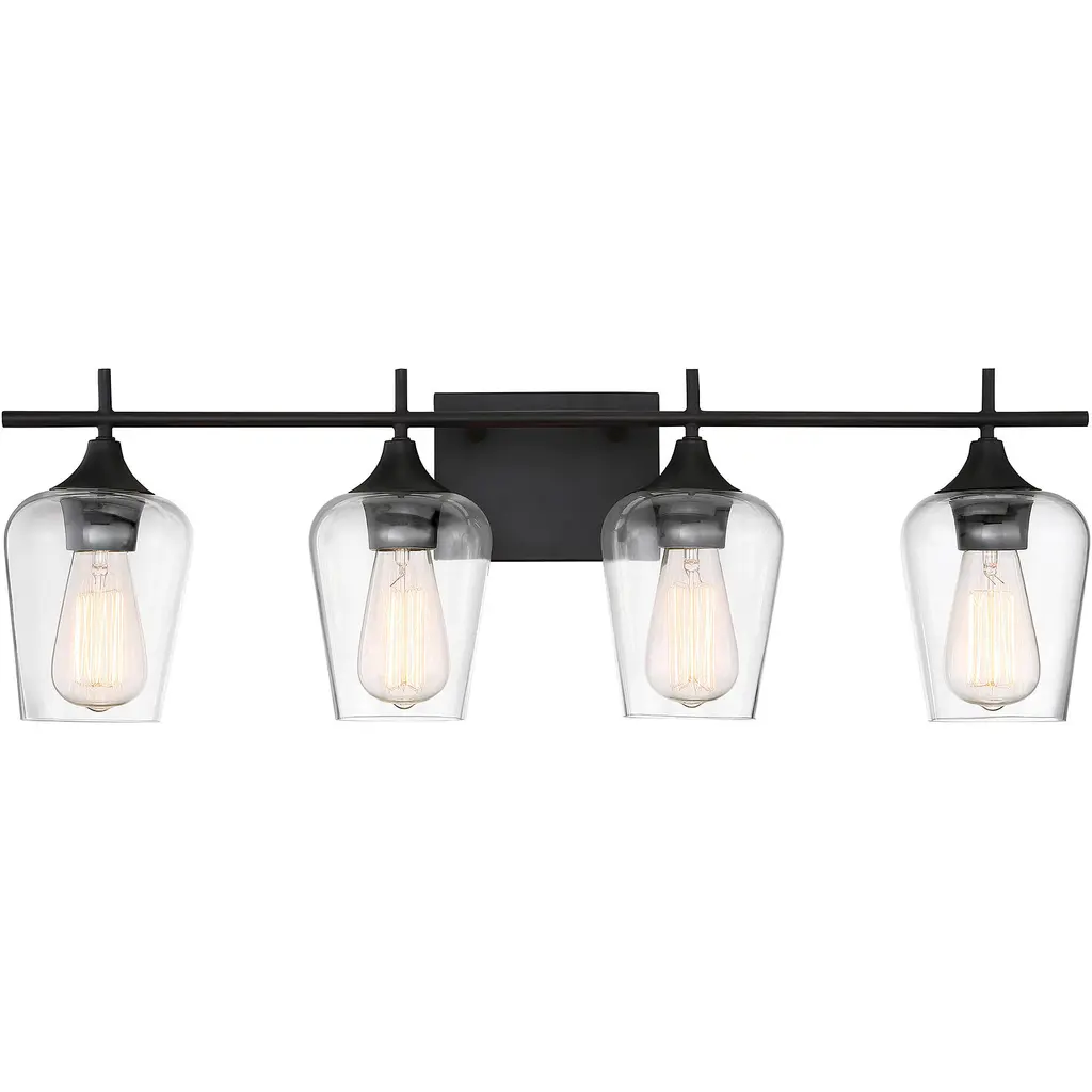 Four Light Bath from Octave collection in English Bronze finish. Number of Bulbs 4. Max Wattage 100.00 . No bulbs included. The Octave 4-light bath bar from has understated elegance. It features large curved shades of clear glass, minimal detailing and an English bronze finish. Fixtures may be mounted as either uplight or downlight. No UL Availability at this time.