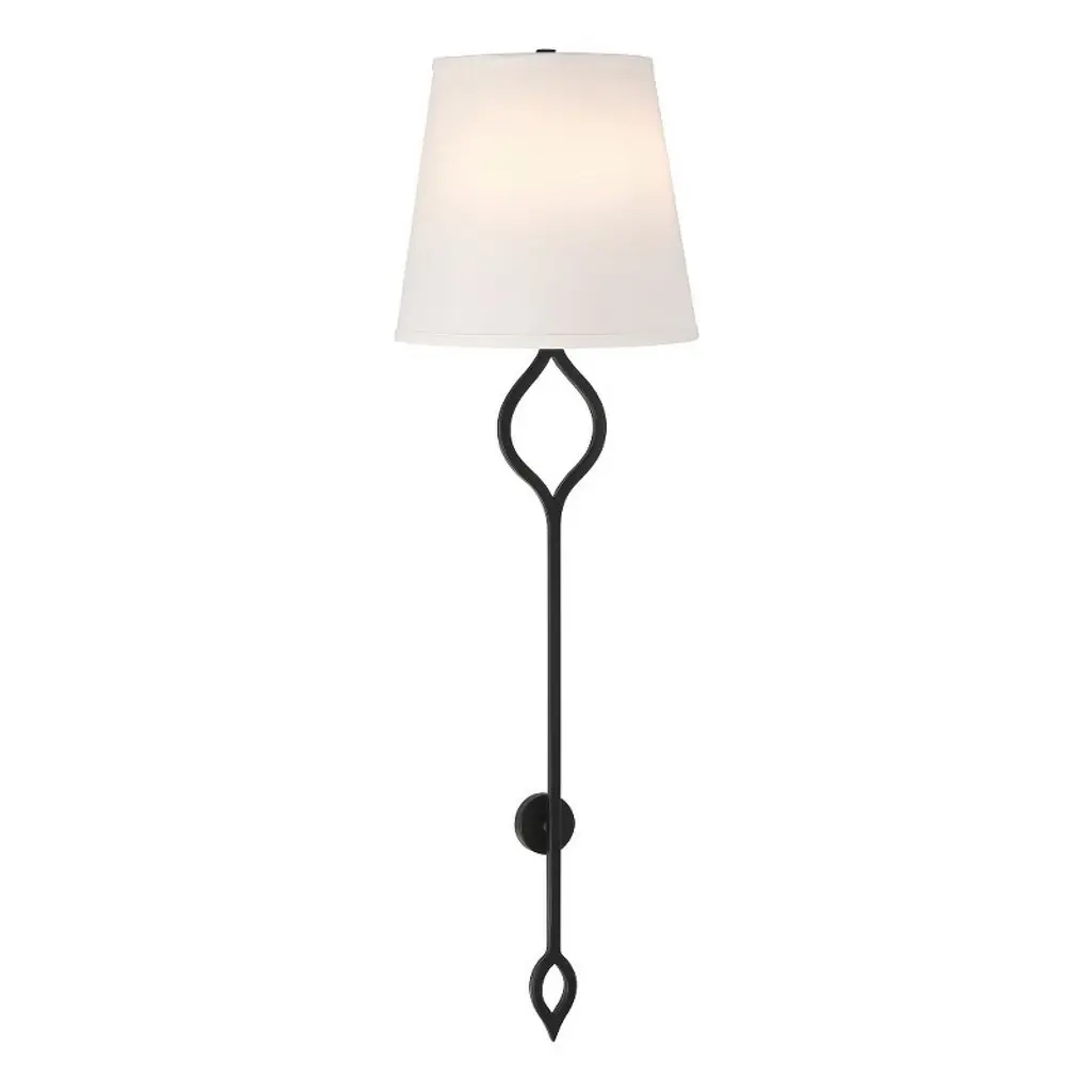 Collection: Roxbury, Material: Linen, Finish Color: Matte Black, Width: 9.5", Height: 31.5", Depth: 6", Backplate Width: 6", Backplate Length: 7.75", Lamping Type: Incandescent, Number Of Bulbs: 2, Wattage: 60 Watts, Dimmable: Yes, Moisture Rating: Damp Rated, Desc: Add a stately lighting look to any space with this Savoy House Roxbury 2-light sconce. Its arm, finished in Warm Brass, showcases thoughtfully placed detailing that contrasts nicely with the white fabric shade. Roxbury is 31.5" in height, 9.5" in width and extends 6" from the wall. Uses two candelabra size bulbs of up to 60 watts per bulb. Bulbs not included. This sconce is damp area rated.,