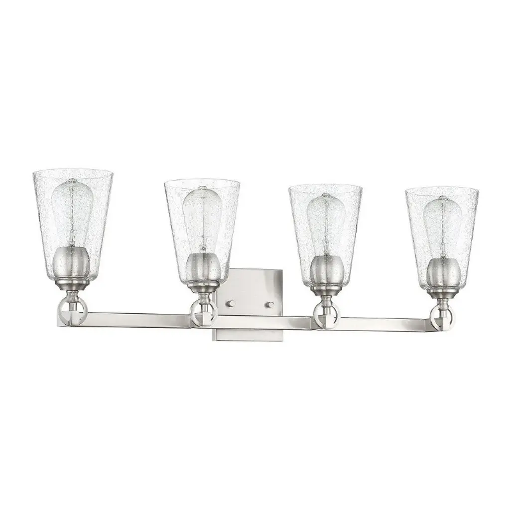 A clean, streamlined design with clear seeded glass shades defines the Sacremento Collection. Measuring 32" wide x 8 ½" high x 5 3/8" extension, this four-light bath bar in a satin nickel finish provides ample illumination from four 60-watt Edison-base bulbs. Material: Glass, Finish Color: Satin Nickel, Width: 32", Height: 8.5", Depth: 5.38", Backplate Width: 8", Backplate Length: 5", Lamping Type: Incandescent, Number Of Bulbs: 4, Wattage: 60 Watts, Dimmable: Yes, Moisture Rating: Damp Rated