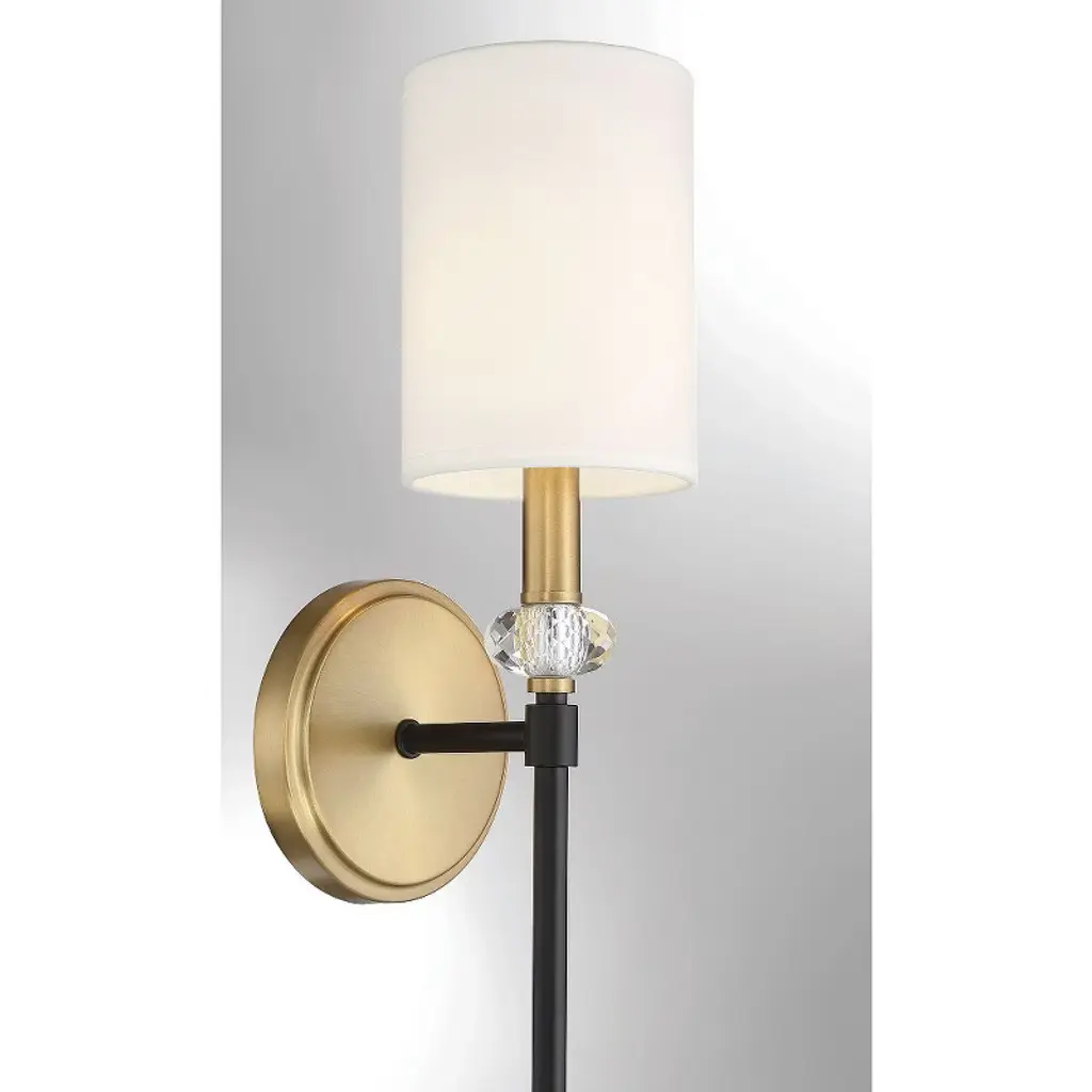 The Savoy House Tivoli 1-light wall sconce has a whimsical yet glamorous look that is truly perfect for today's homes. A long and slender stem is topped with a white fabric shade and decorated with a faceted crystal bauble. Finished in a beautiful two-tone matte black with warm brass accents. Tivoli is 19" in height, 5" in width and extends 6" from the wall. It uses one candelabra size bulb of up to 60 watts. Damp area rated.