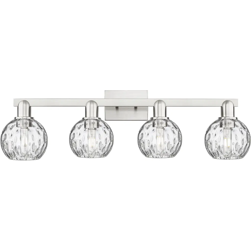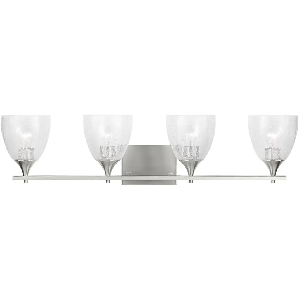 If you want a fresh, elegant lighting look in your bathroom, the Savoy House Vaughan 4-light bath bar is the perfect choice. Its sleek design showcases tall fluted shades of clear water glass that are held snugly in place with clasps and screws. The satin nickel finish works beautifully with many different colors of bathroom furnishings and hardware. This fixture is 32.5" wide and 9.25" tall. It extends 6ï¾" from the wall. Uses 4 standard size bulbs of up to 60 watts each (not included).