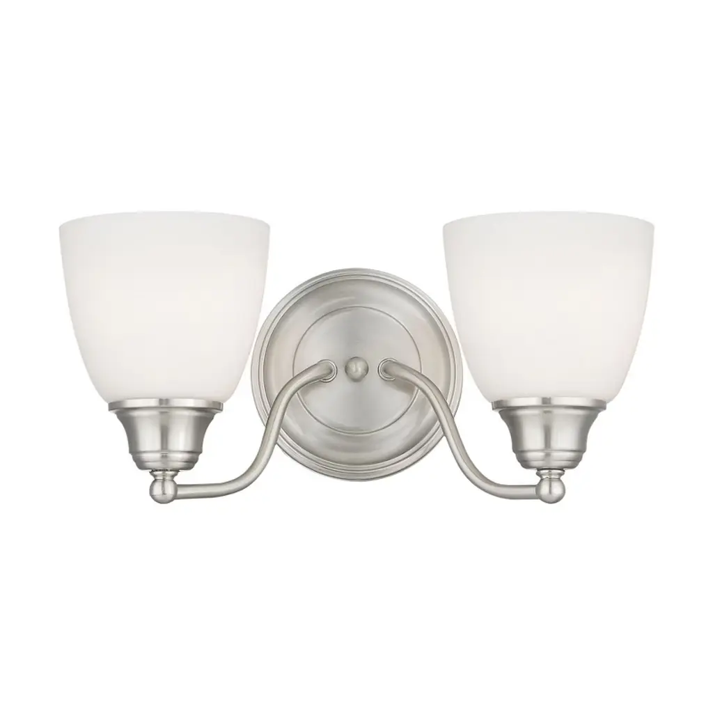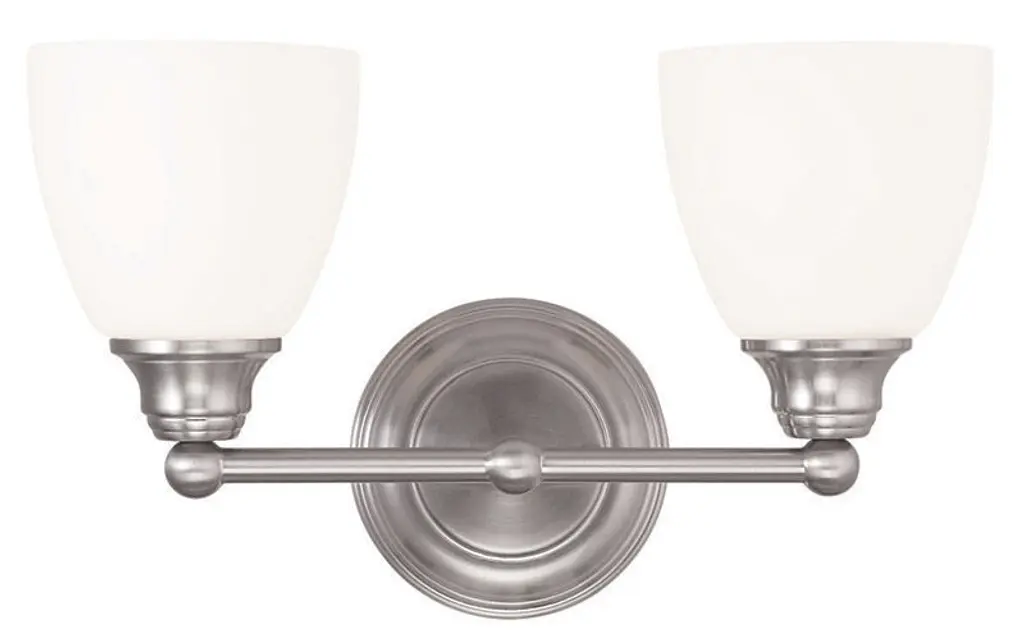 The Yates has classic traditional style for flattering light in the bath. The style is elegant and familiar: a perfect choice above the vanity, to make everyone feel comfortable. The oval wall plate supports two graceful, curved light arms with bell-shaped shade holders and decorative ball finials, all with a rich, lustrous, pewter finish. The two bell-shaped shades are made of lovely, white colored glass for even more classic appeal. And each glass shade encloses a 60W, E-style bulb for soft, glare-free illumination. The fixture measures 15” wide, 9” high, and extends 7.5” from the wall. Plus, this bath bar may be mounted as uplight or downlight —either way, it’s timeless style for your bathroom or powder room.