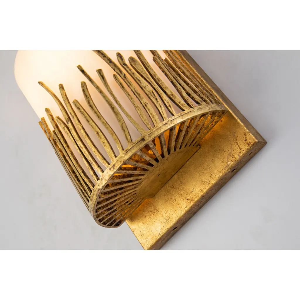 Find the light you love with this graceful and timeless gold leaf wall sconce. The relaxing and spa-like feel of this wall sconce, gives a beautiful silhouette that makes it the perfect choice to flank your bathroom mirror, place in your dining space or use in your favorite reading nook. The half drum piece of frosted glass sits perfectly in the gold grass-like holder allowing the perfect amount of light to flow into your space. Showing off our attention to details as the light beautifully shines through the bottom design as well as the grass-like shapes. Measuring 6" wide and 10" tall with a 4.5" depth, this wall sconce can be used in any space.