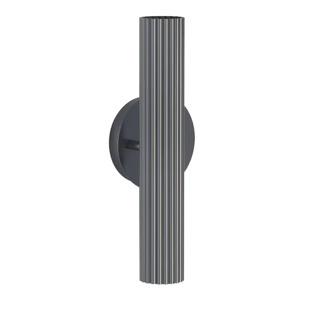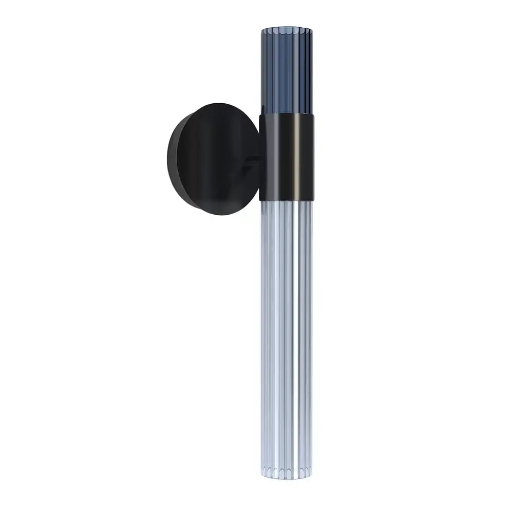An essential black-toned brass structure anticipates the exquisitely contemporary appeal marking this sconce from the Sbàrlusc Collection. Named after the Milanese dialectal word indicating the sheen of a bright tiny object, It was designed to impress with its stunning glare that, filtering through ridged glass cylinders, creates marvelous interplays of reflections. Colorful options are also available. Please contact the Concierge for additional information.