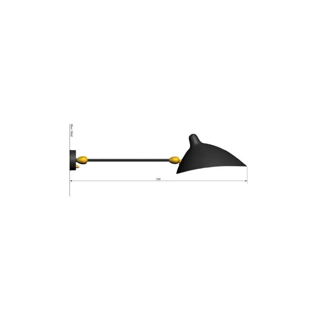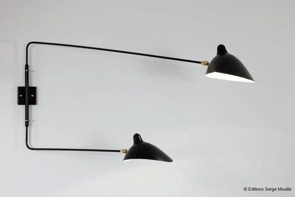 Sconce 1 rotating curved arm by serge mouille dimensions: d99 x h40 cm materials: brass, steel, aluminum one of a king. Numbered. Also available in different color. All our lamps can be wired according to each country. If sold to the usa it will be wired for the usa for instance. From the "formes noires" series, the serge mouille wall lamp with 1 curved pivoting arm is a reissue of an iconic model from 1953. up to 250v (europe/uk standard).