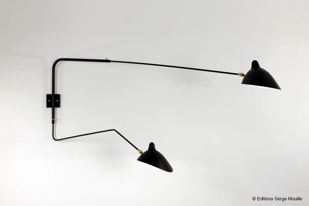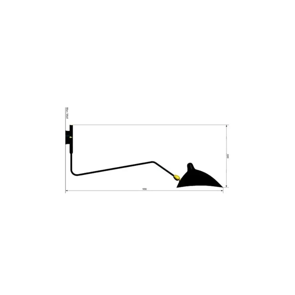 Sconce 1 rotating curved arm by serge mouille dimensions: d99 x h40 cm materials: brass, steel, aluminum one of a king. Numbered. Also available in different color. All our lamps can be wired according to each country. If sold to the usa it will be wired for the usa for instance. From the "formes noires" series, the serge mouille wall lamp with 1 curved pivoting arm is a reissue of an iconic model from 1953. Made in france by éditions serge mouille, it has a curved arm in painted steel. Black and an adjustable aluminum reflector on a brass ball joint. up to 250v (europe/uk standard).