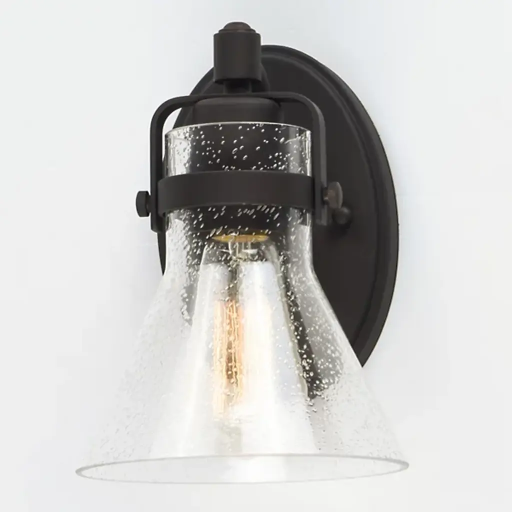 Incorporating nautical character into indoor bathroom spaces. The Seafarer Bath Wall Sconce by Maxim Lighting is a conical shade made of clear seeded glass with an opening at the bottom. It is suspended from a steel yoke frame to infuse an industrial flair. A matching oval backplate completes this design and mounts it to the wall. This damp-rated fixture can hold an incandescent lamp (sold separately) that produces a warm glow, highlighting the water droplets and creating an intriguing visual experience.