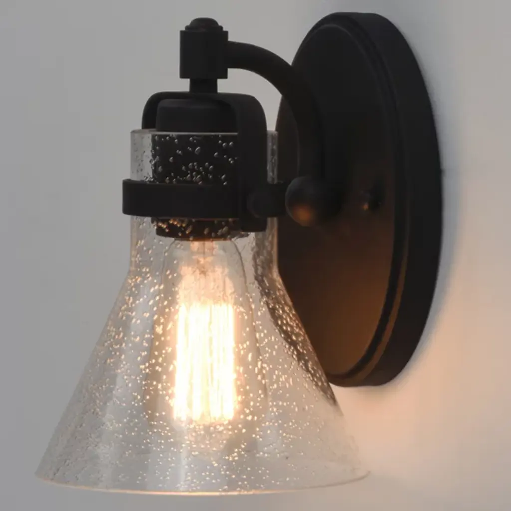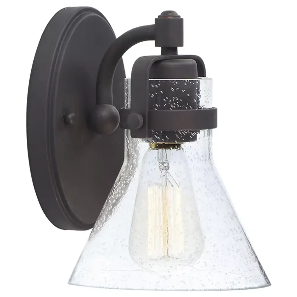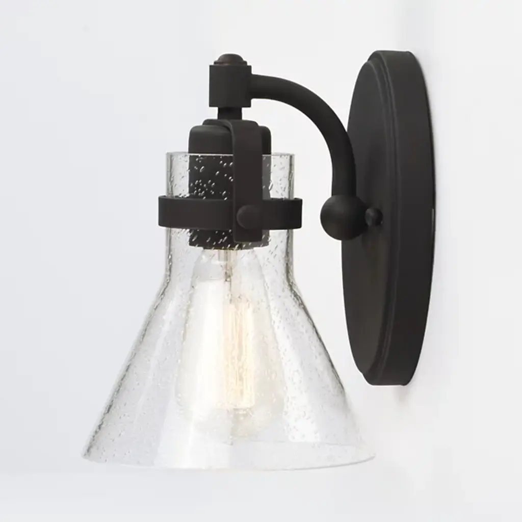 Incorporating nautical character into indoor bathroom spaces. The Seafarer Bath Wall Sconce by Maxim Lighting is a conical shade made of clear seeded glass with an opening at the bottom. It is suspended from a steel yoke frame to infuse an industrial flair. A matching oval backplate completes this design and mounts it to the wall. This damp-rated fixture can hold an incandescent lamp (sold separately) that produces a warm glow, highlighting the water droplets and creating an intriguing visual experience.