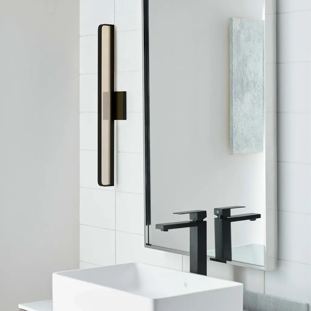 Designed with modern appeal, the Banda 36 Bath Bar by Sean Lavin provides a clean aesthetic with straight-lines and crisp edges enveloping integrated LEDs providing up and downlight. Designed at a generous length of 36 inches, Banda is perfect for vanity and bathroom lighting. Available in three modern finishes, a Natural Brass that will patina over time, Chrome and Matte Black to fit your modern style. Lamping options are compatible with most dimmers. Refer to Dimming Chart for more information. Features