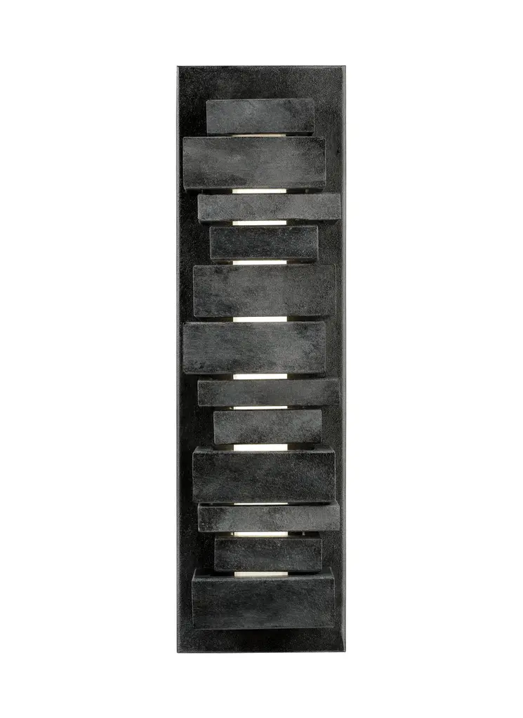 The Ledgend one light outdoor wall fixture in dark weathered zinc creates a warm and inviting welcome presentation for your home's exterior. The Ledgend outdoor light wall sconces by are modern and dramatic, making a significant design statement as visitors reach the front door. Energy efficient and long-lasting LEDs direct light forward through off-set openings inspired by stacked flagstone, as well as shining up and down. Made of Cast Aluminum, the fixture has exceptional durability to withstand the harshest elements. With a Dark Weathered Zinc finish, the assortment includes 5", 18" 26"and 34" LED outdoor wall sconces. Designer: Sean Lavin Extension: 3 3/8 Backplate: DP:1 1/8'' W:5'' H:17 1/2'' OB UP:8 3/4'' Rectangular Shade/Glass: white glass diffuser Lamping: 1 LED Integrated 22 watt light bulb Voltage: 120 Bulb Included: Yes Safety Rating Location: wet