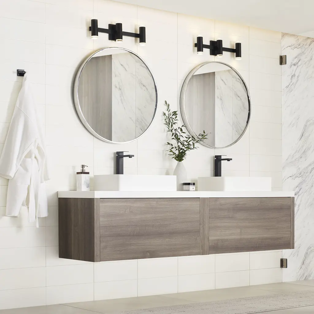 The Dobson bath light by Sean Lavin is sleek and ultra-modern with its cylindrical glass shade and illuminated ring of pure optic crystal. Available in modern finishes. The Dobson bath light is available in a two or three vanity light option and comes with an energy efficient integrated LED lamp, this lamp option is fully dimmable to create the desired ambiance in your special space. The Dobson bath bar is the latest addition into the Dobson family, simply search for the Dobson bath to find its closest relatives.