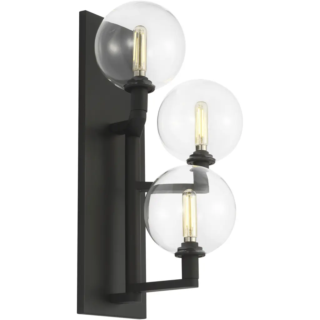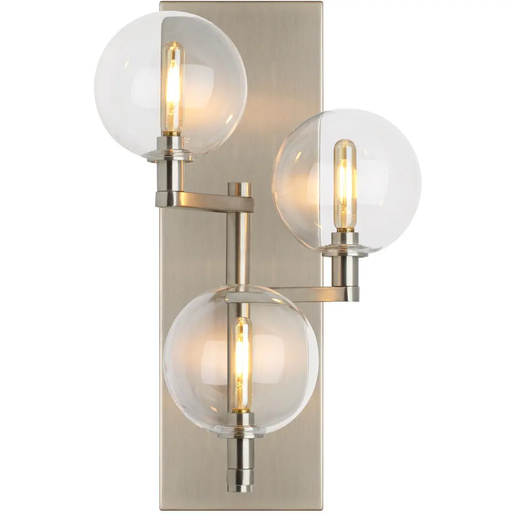 The Gambit Triple LED wall sconce light from Visual Comfort exudes undeniable beauty and warm contemporary style through its bold use of high end mixed materials and retro-inspired, fully dimmable LED lamping. Available in modern finishes. This broadly appealing contemporary design is offered in two sizes, the petite 1-lite and scalable 3-lite, each with its own unique silhouette. Both sizes offer a convergence of contrasting elements including hard lines from their elegantly plated metal hardware and soft curves from their seemingly delicate yet durable borosilicate glass globes. Together with the coordinating Gambit chandelier and various Gambit multi-port chandeliers also from Visual Comfort, these distinctive wall sconce lights are sure to add an incredibly warm allure to dining room lighting, kitchen lighting and living room lighting applications alike. No Lamp rated for (3) 5 watt max. E12 candelabra base lamp. LED includes (3) 2 watt, 497 delivered lumen, 90 CRI 2700K, LED E12 candelabra base lamp. No lamp version mounts up only. LED mounts up or down.
