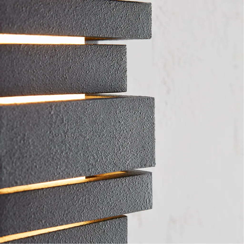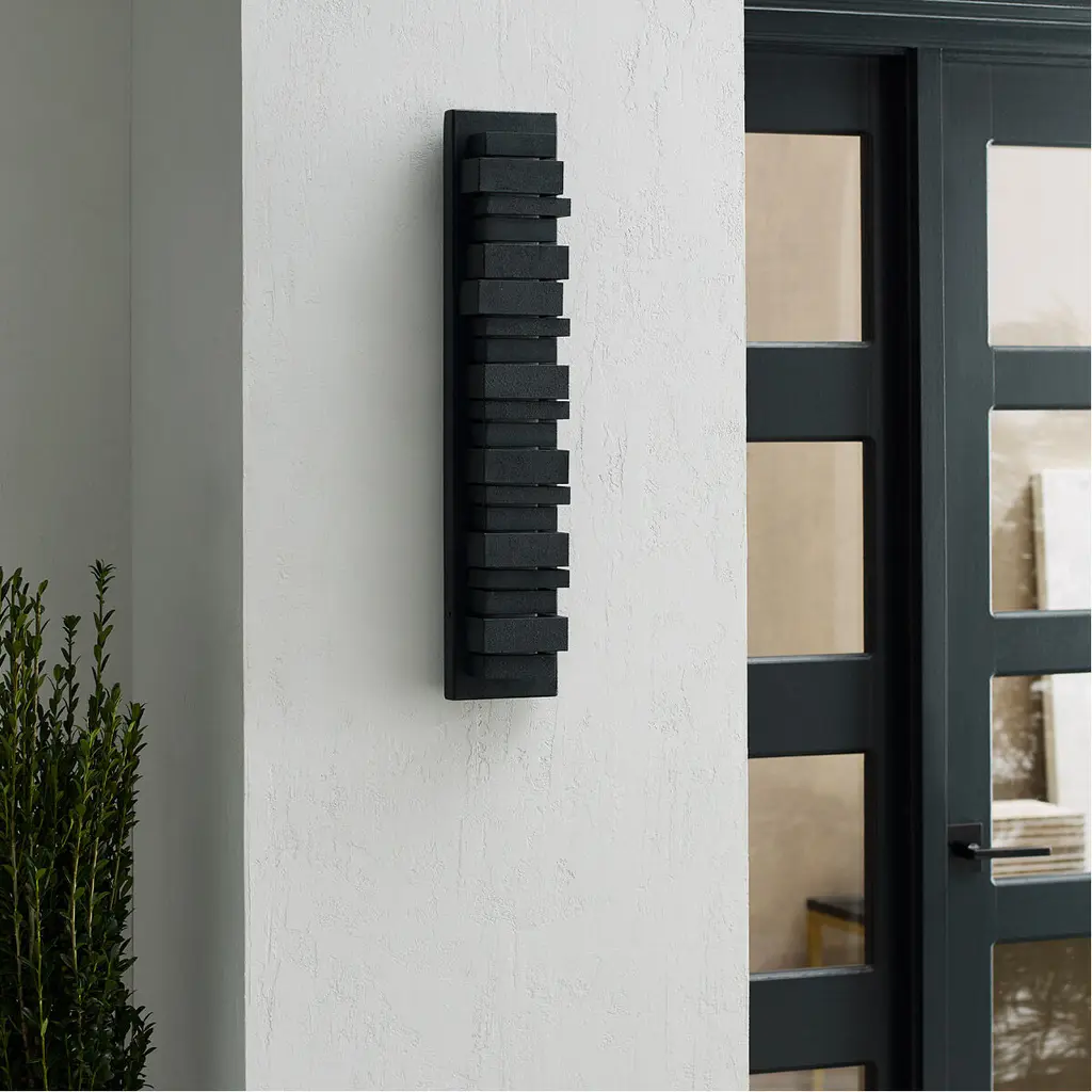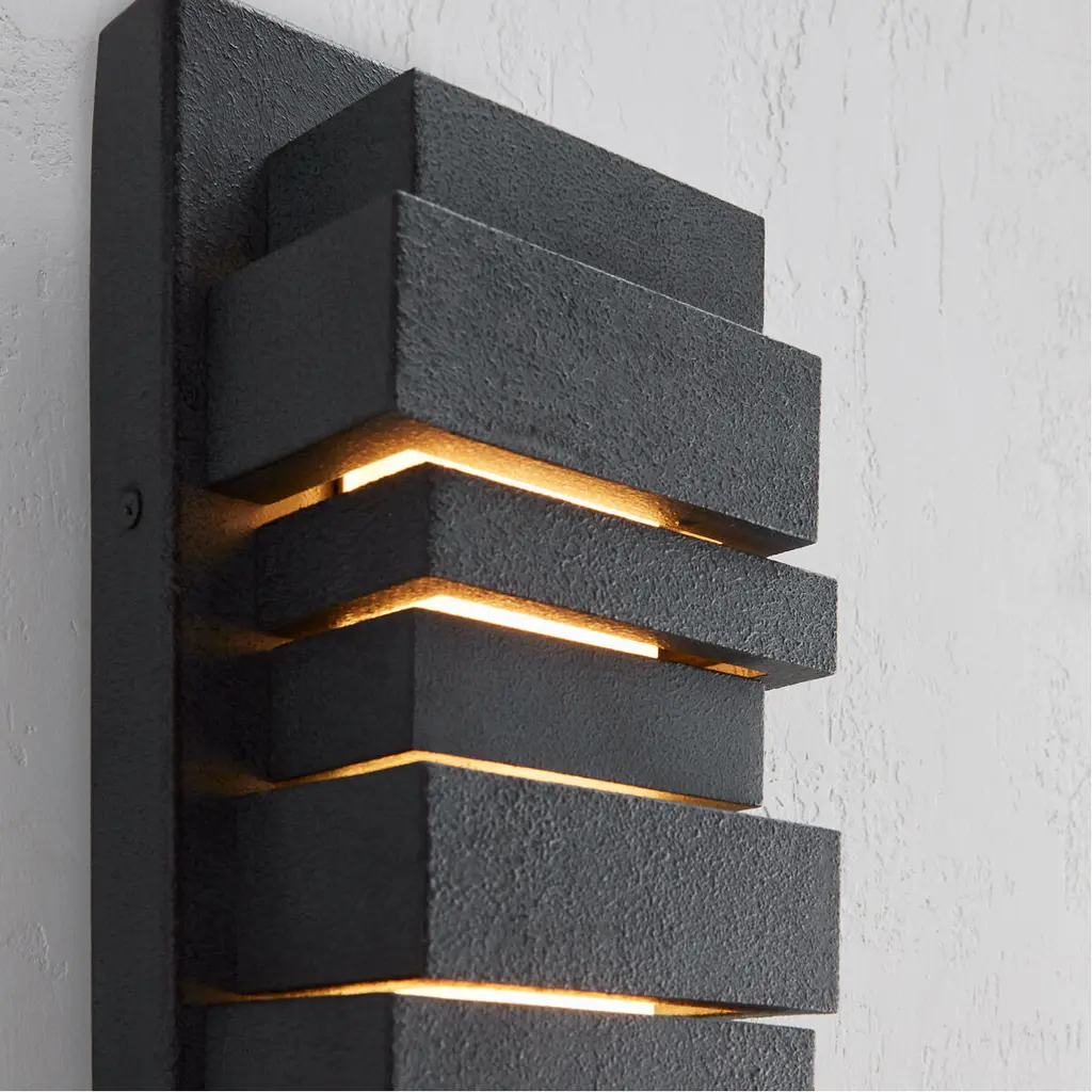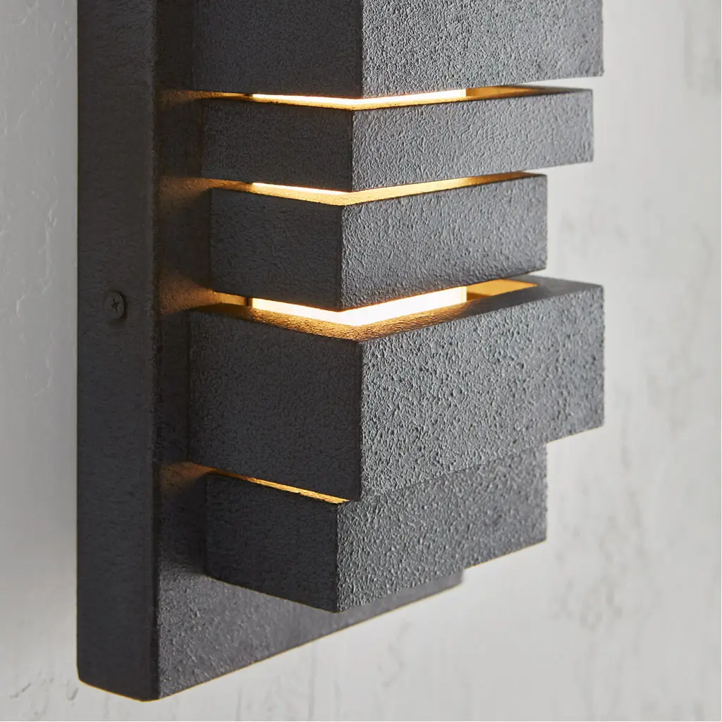 The Ledgend one light outdoor wall fixture in dark weathered zinc enhances the beauty of your property, makes your home safer and more secure, and increases the number of pleasurable hours you spend outdoors. The Ledgend outdoor light wall sconces by are modern and dramatic, making a significant design statement as visitors reach the front door. Energy efficient and long-lasting LEDs direct light forward through off-set openings inspired by stacked flagstone, as well as shining up and down. Made of Cast Aluminum, the fixture has exceptional durability to withstand the harshest elements. With a Dark Weathered Zinc finish, the assortment includes 5", 18"? 26?and 34"? LED outdoor wall sconces.
