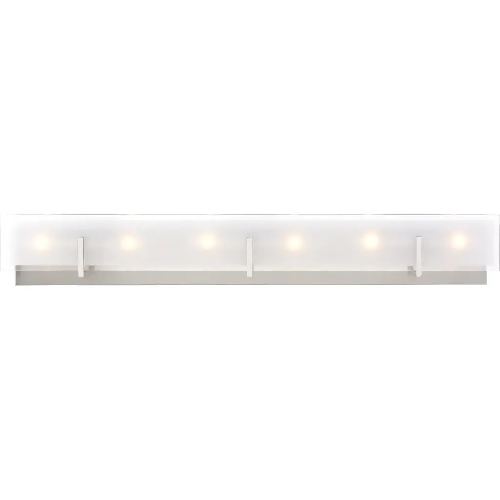 The Syll six light vanity fixture in chrome offers shadow-free lighting in your powder room, spa, or master bath room. Syll features a stylish frame with brilliant frosted beveled glass panels.