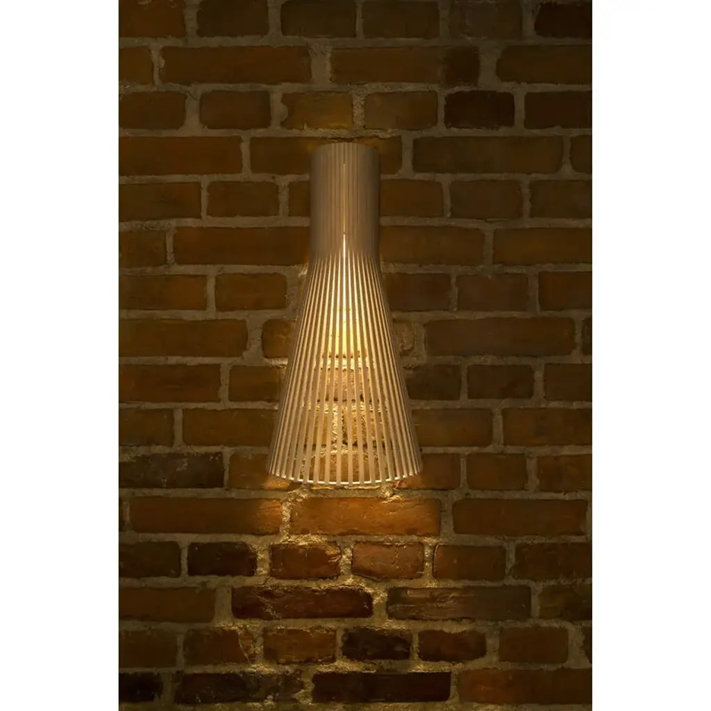 Secto 4230 is an elegant wall lamp with a slatted, wooden shade that fills the space with gentle light. The bold yet lightweight wall lamp can be mounted on the wall either upwards or downwards. Secto Design luminaires are handmade in Finland from form-pressed Finnish birch. The lamps have clean Scandinavian silhouettes, and the wooden surface gives them a warm and appealing character. Secto lamps are designed by architect Seppo Koho who wanted to develop a softly filtering light that doesn’t dazzle but invites people to come closer. Secto lamps emphasize space and environment by creating a unique atmosphere and feeling of closeness.