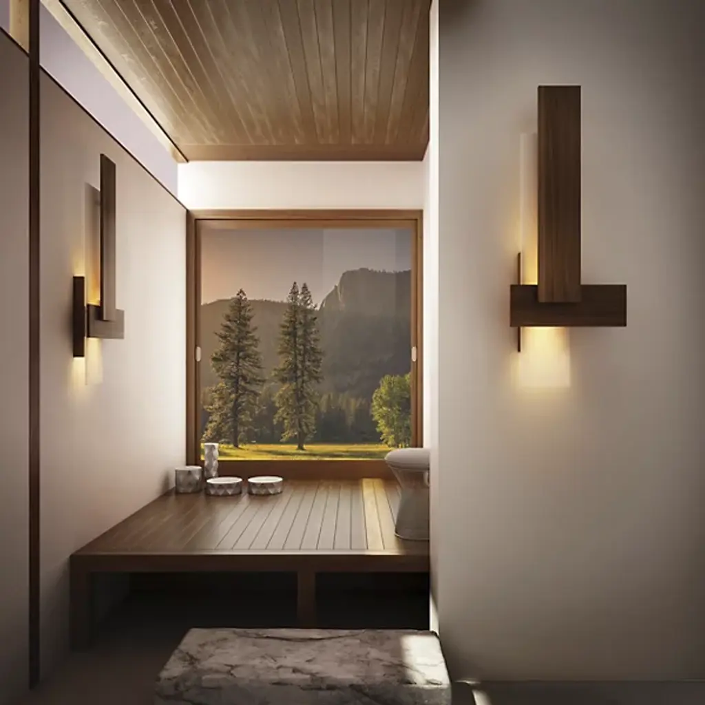 Three floating planes intersect in the Cerno Sedo Wall Sconce. Two walnut planks sit perpendicular over the frosted glass diffuser, covering the light source while also drawing the eye to the diffused light up and down the wall. Arranged like a geometric minimalistic painting, the design upholds the heralded ideals that geometric forms and lines can be pleasing and inviting.
