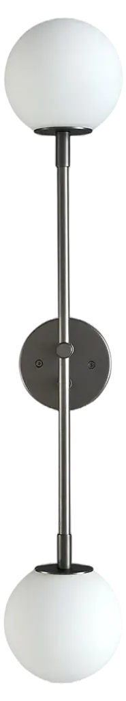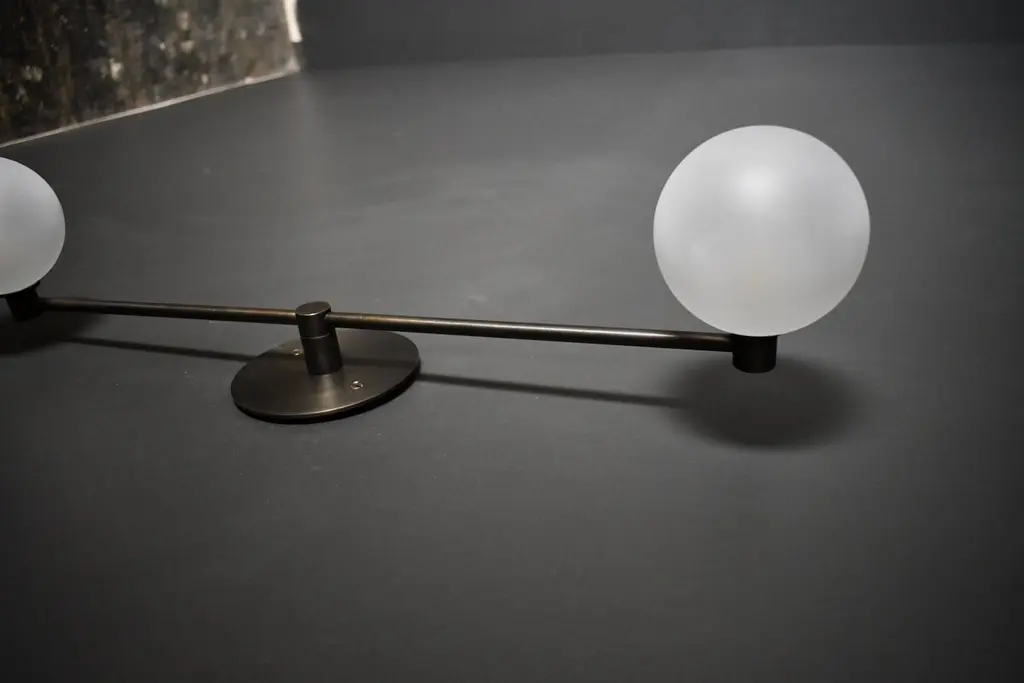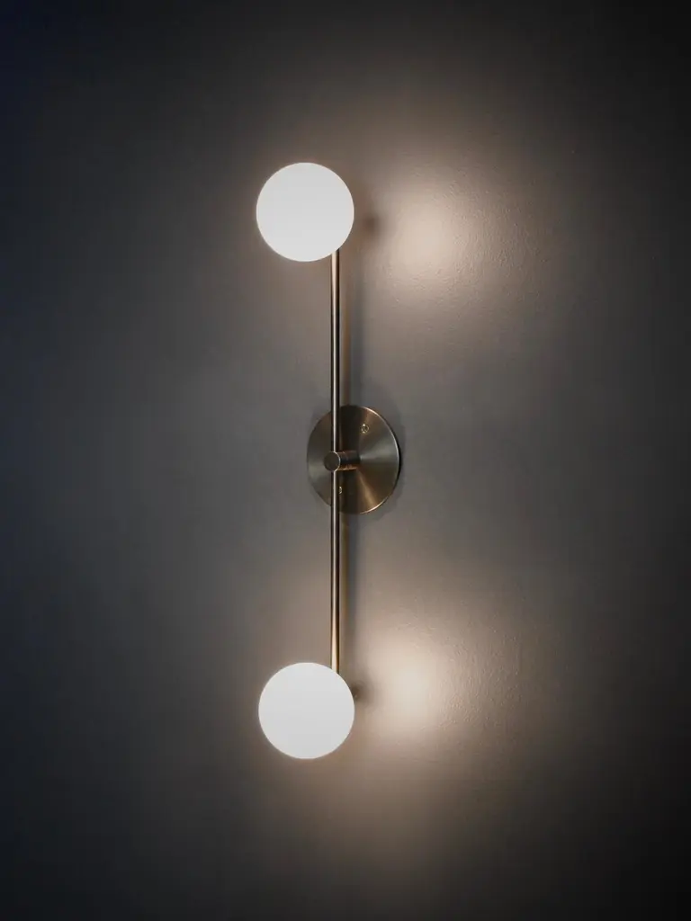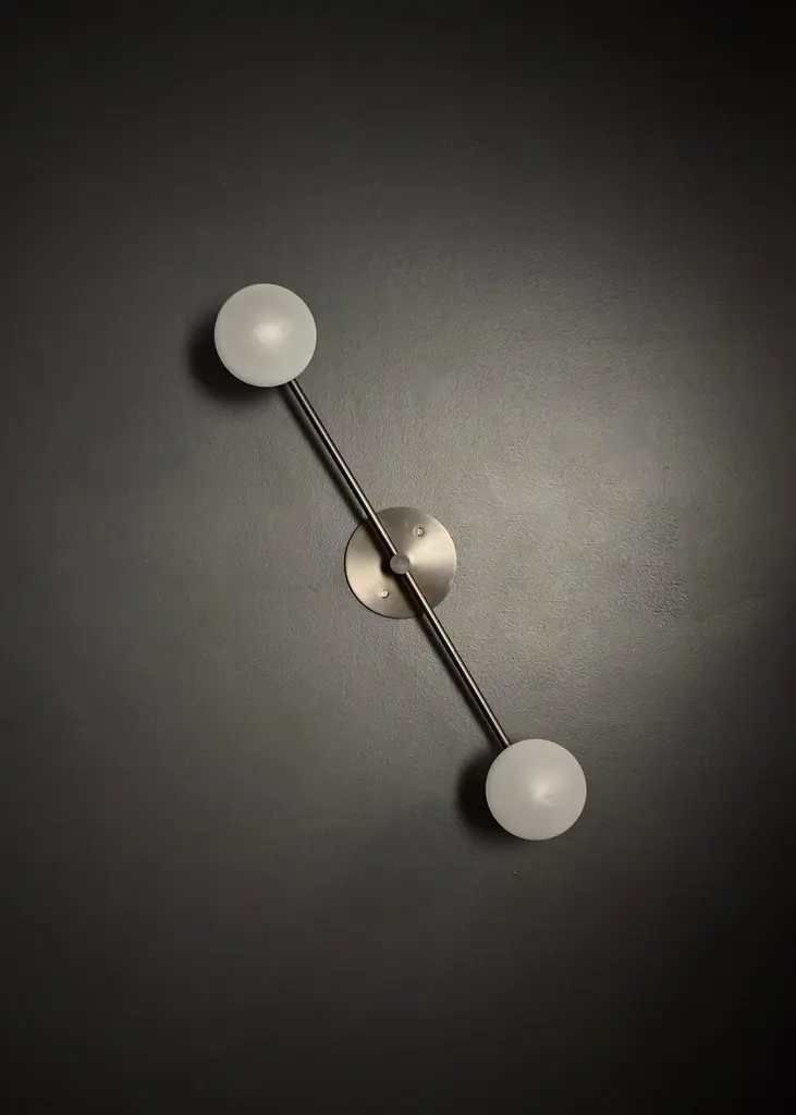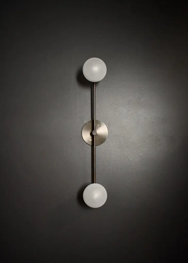 Segment wall lamp or flushmount ceiling fixture by Blueprint Lighting, 2020.A handsome study in clean lines and simple form inspired by the tenets of the Bauhaus, Segment is truly a go-anywhere design and is equally at home in residential, commercial and hospitality projects. This pieces can function as a wall sconce or as a flushmount ceiling light.Segment is shown here in our hand-finished Bronze, but may be made in any of our 6 in-house metal finishes or 36 in-house enamel colors. Dimensions: 24" H x 5" W x 5" D blown opal glass globes are 4" diameterSpecs: Uses two (2) G9 socket bulbs (halogen-style socket with 2 pins). We recommend G9 LED bulbs in a T4 shape: 5w LED with 60 watt equivalent. Bulbs included. Dimmable. UL-listed.
