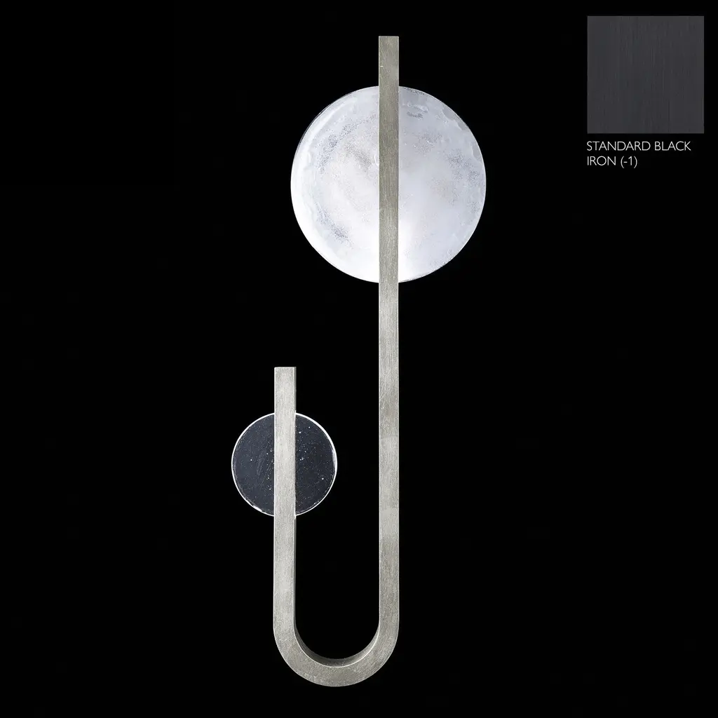 Sculptural right side facing linear sconce inspired by the Greek goddess of the moon, Selene. Features illuminated hand cast glass in Full Moon white and New Moon Clear. Available in Standard Finishes, Black Iron, Gold Leaf, Silver Leaf and Soft Gold Le
