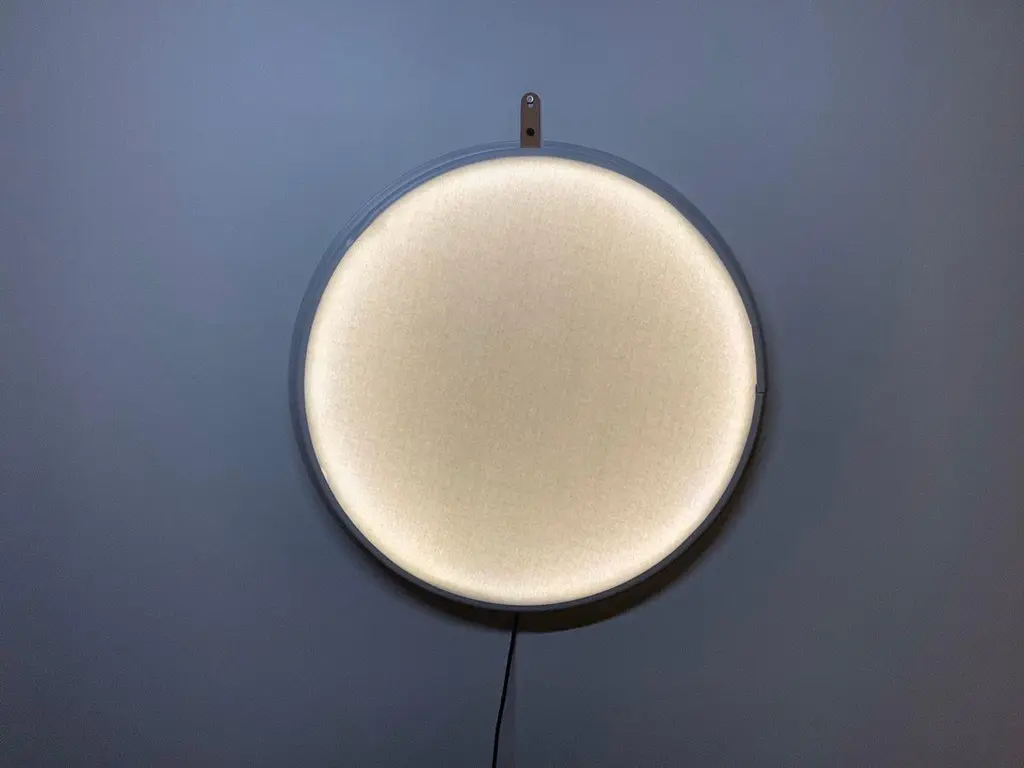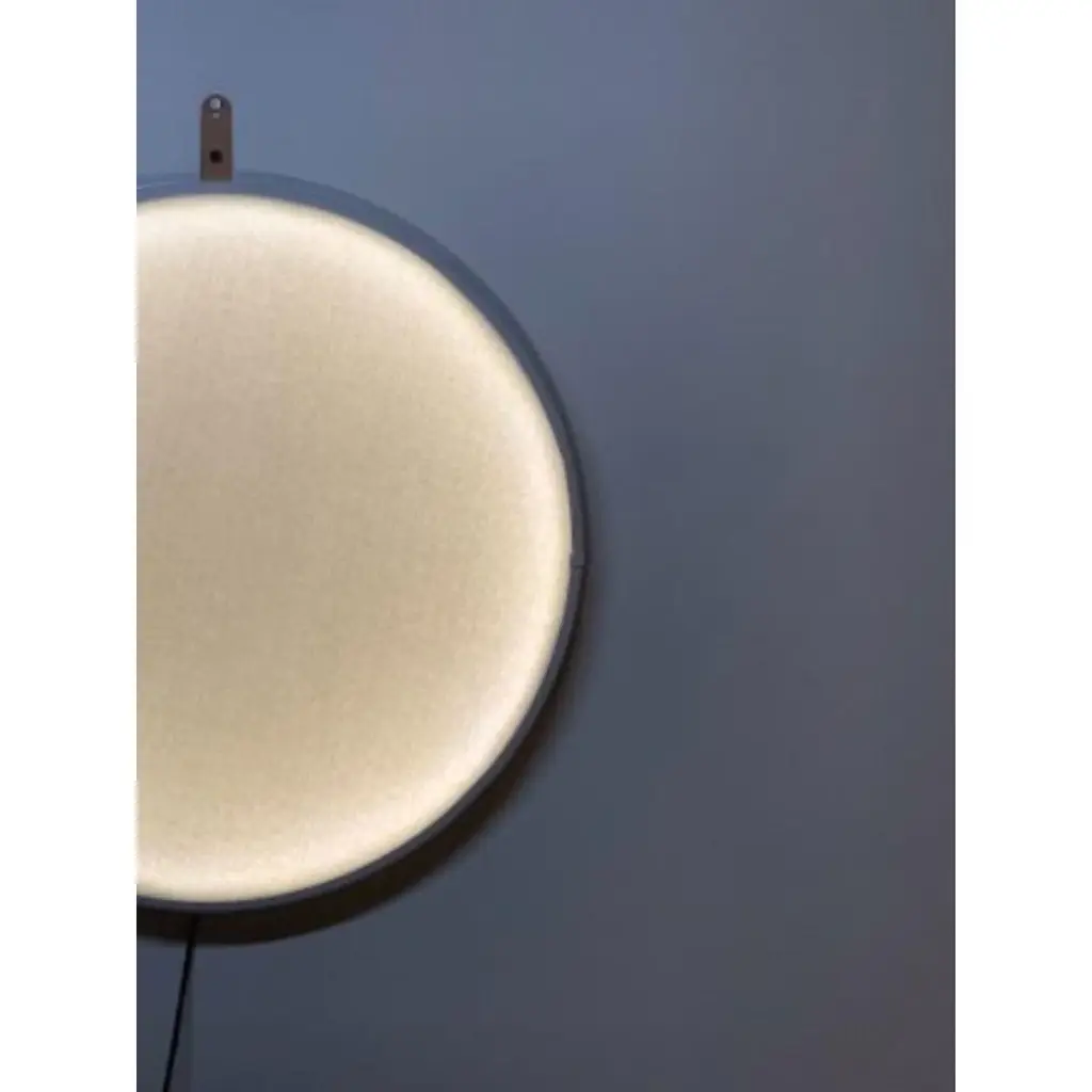 Selene wall lamp by Studio LampentEdition of 5Dimensions: D 62 x H 6 cmMaterials: upcycled metal ring, acrylic, feltWeight: 2.8 kg.All our lamps can be wired according to each country. If sold to the USA it will be wired for the USA for instance."Selene is a circular wall lamp aiming to create a memorable light experience. The object's main form is defined by a reworked aluminium ring, initially salvaged from metal-recycling containers. The light is diffused through the semi transparent felt sheet creating a subtle and calming glow in the ambience. Selene is crafted in small batches per demand and is purposed for use in private or public spaces." Studio Lampent is a Sweden based lighting design and artistic studio, founded and driven by Stavros Kotsakis since 2011. The name Lampent is the conjunction of the words lamp and lambent and describes our main goal: to create lighting products with a playful radiance.With the purpose to explore the endless adventures of light while interacting with fascinating materials, we are dedicated in designing series of exclusive handcrafted luminaires which add a genuine warmth to a wide range of interiors. Putting light into the center point of the development process allows the creative journey from form to function to happen. Becoming itself part of symmetrical structures or transformed objects, light is being naturally turned into a basic element for geometry.