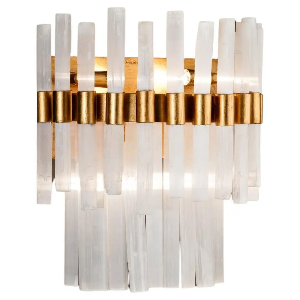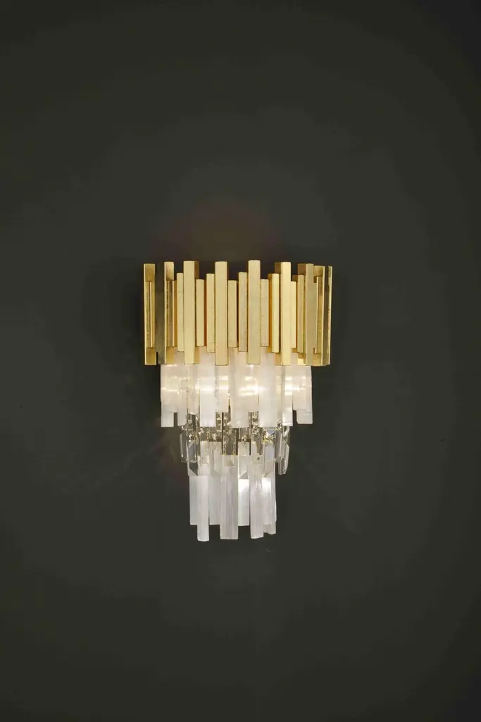 Selenite wall sconce by Aver Dimensions: D 20 x W 35 x H 45 cm Materials: Natural/clear Moroccan Selenite rock.Lighting: 3 x G9.Finishes: Gold Leaf, Silver Leaf, Warm Gold Leaf, Warm Silver Leaf, Warm Copper Leaf, Dark Gold Leaf, Dark Silver Leaf, Bronze Leaf, Antique Bronze, Antique Golden.All our lamps can be wired according to each country. If sold to the USA it will be wired for the USA for instance.The history of Aver Metais as a lighting brand begins with Jefferson Aver manufacturing lamps in a completely handcrafted way and with very few resources in the family business. Over the years, the brand has grown and gained recognition. Today, our products are present in several projects by prestigious professionals, in addition to being resold in lighting boutiques in different regions of Brazil. Through its partners, Aver Metais has several participations in important design and architecture exhibitions. In 2015 the company started its internationalization process and today has clients and projects carried out in places like New York, Los Angeles, Chicago, Dallas, Miami, London, Cardiff, Hamburg, Manila, Santa Cruz de la Sierra, and Lima, attesting to the level quality and competitiveness of Aver Metais products.In our factory, each piece is meticulously produced using modern production processes combined with craftsmanship to detail. The result is original pieces that, more than illuminate, are jewels for your home. Over the years, the brand has been dedicated to creating and producing original and high-quality decorative lighting fixtures that can fit into the most varied and demanding interior architecture projects.