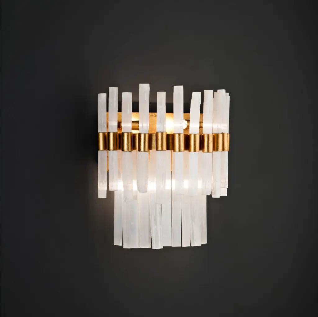 Selenite wall sconce by AverDimensions: D 19 x W 28 x H 35 cm.Materials: Moroccan natural selenite rock, metal.Lighting: 4 x G9Finishes: Gold Leaf, Silver Leaf, Warm Gold Leaf, Warm Silver Leaf, Warm Copper Leaf, Dark Gold Leaf, Dark Silver Leaf, Bronze Leaf, Antique Bronze, Antique Golden. All our lamps can be wired according to each country. If sold to the USA it will be wired for the USA for instance.The Middleton collection is composed by a layer of cut selenite sticks encased in a gold or silver plated metallic ring. Inside layers of rectangular selenite give the lamp a classic shape.The history of Aver Metais as a lighting brand begins with Jefferson Aver manufacturing lamps in a completely handcrafted way and with very few resources in the family business. Over the years, the brand has grown and gained recognition. Today, our products are present in several projects by prestigious professionals, in addition to being resold in lighting boutiques in different regions of Brazil. Through its partners, Aver Metais has several participations in important design and architecture exhibitions. In 2015 the company started its internationalization process and today has clients and projects carried out in places like New York, Los Angeles, Chicago, Dallas, Miami, London, Cardiff, Hamburg, Manila, Santa Cruz de la Sierra, and Lima, attesting to the level quality and competitiveness of Aver Metais products.In our factory, each piece is meticulously produced using modern production processes combined with craftsmanship to detail. The result is original pieces that, more than illuminate, are jewels for your home. Over the years, the brand has been dedicated to creating and producing original and high-quality decorative lighting fixtures that can fit into the most varied and demanding interior architecture projects.