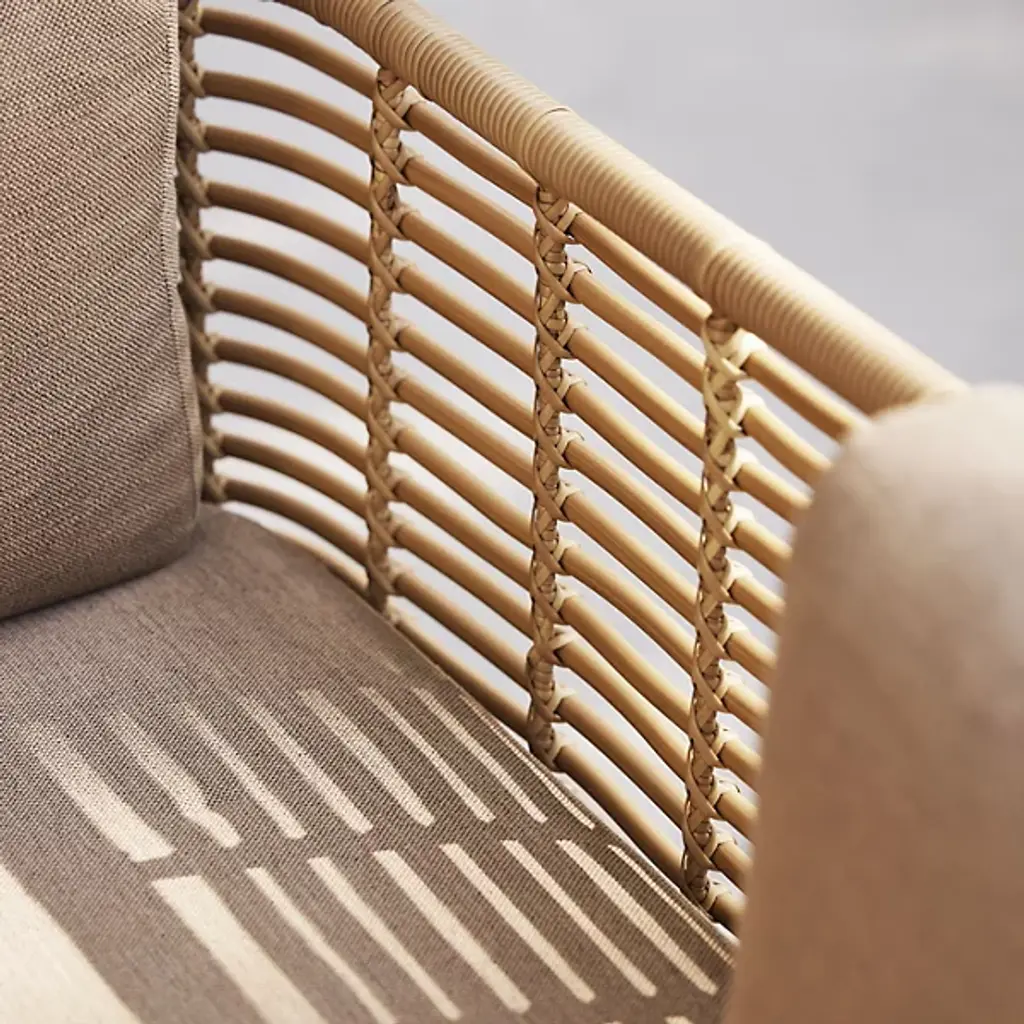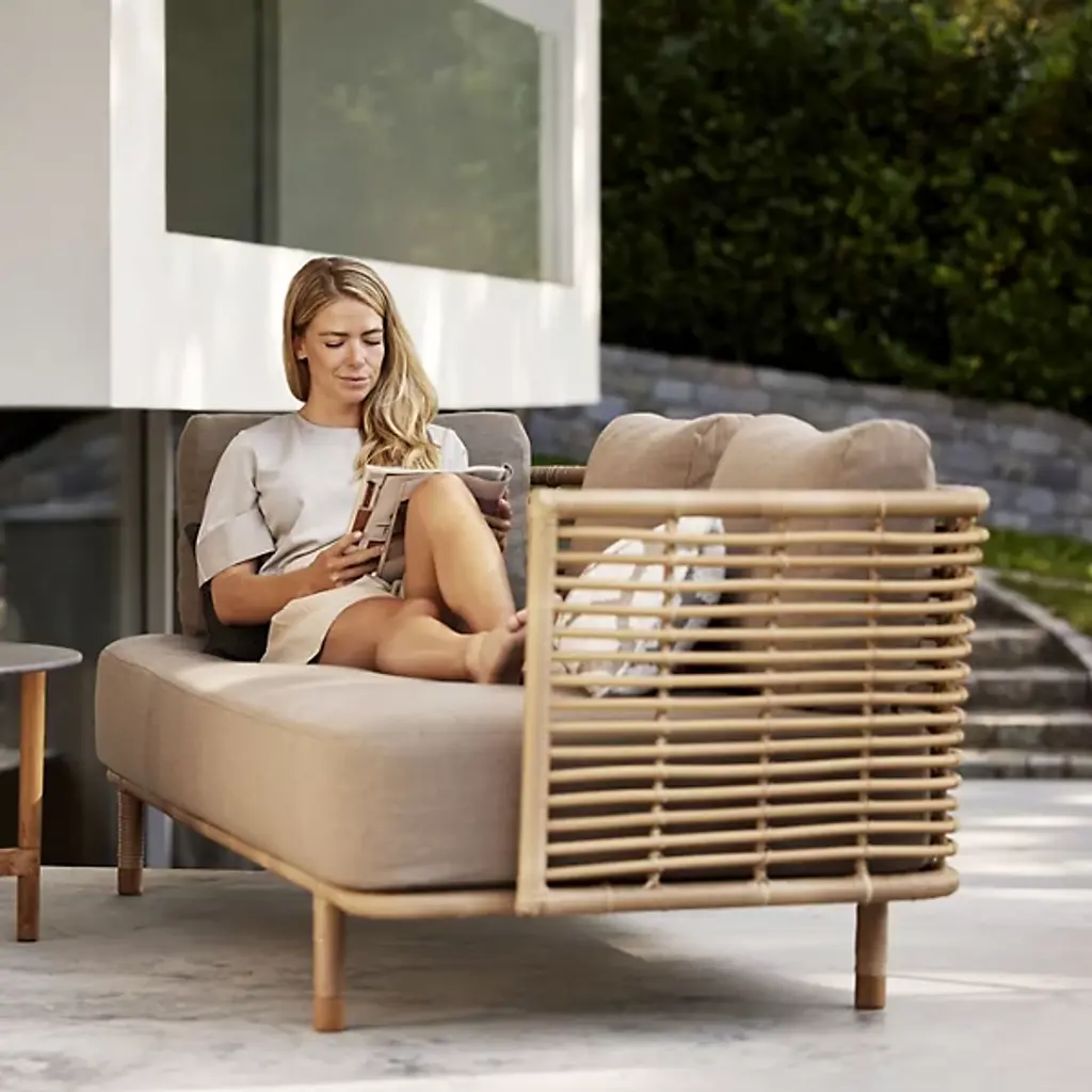 Rest and relax ensconced within the soothing soft-rope strands of the Sense Outdoor 3-Seater Sofa from Cane-line. A daring design from the Danish pair Foersom & Hiort-Lorenzen, it puts a Scandinavian spin on traditional wicker-style design. Four slim, strong legs rise to a rectangular base, seating a soft cushion atop, and it’s able to resist inclement weather with ease. An airy grid of woven material sweeps up to form an encompassing side and back, while smaller cloudlike cushions rest along the back, providing ample comfort in all weather.