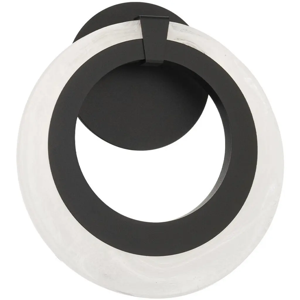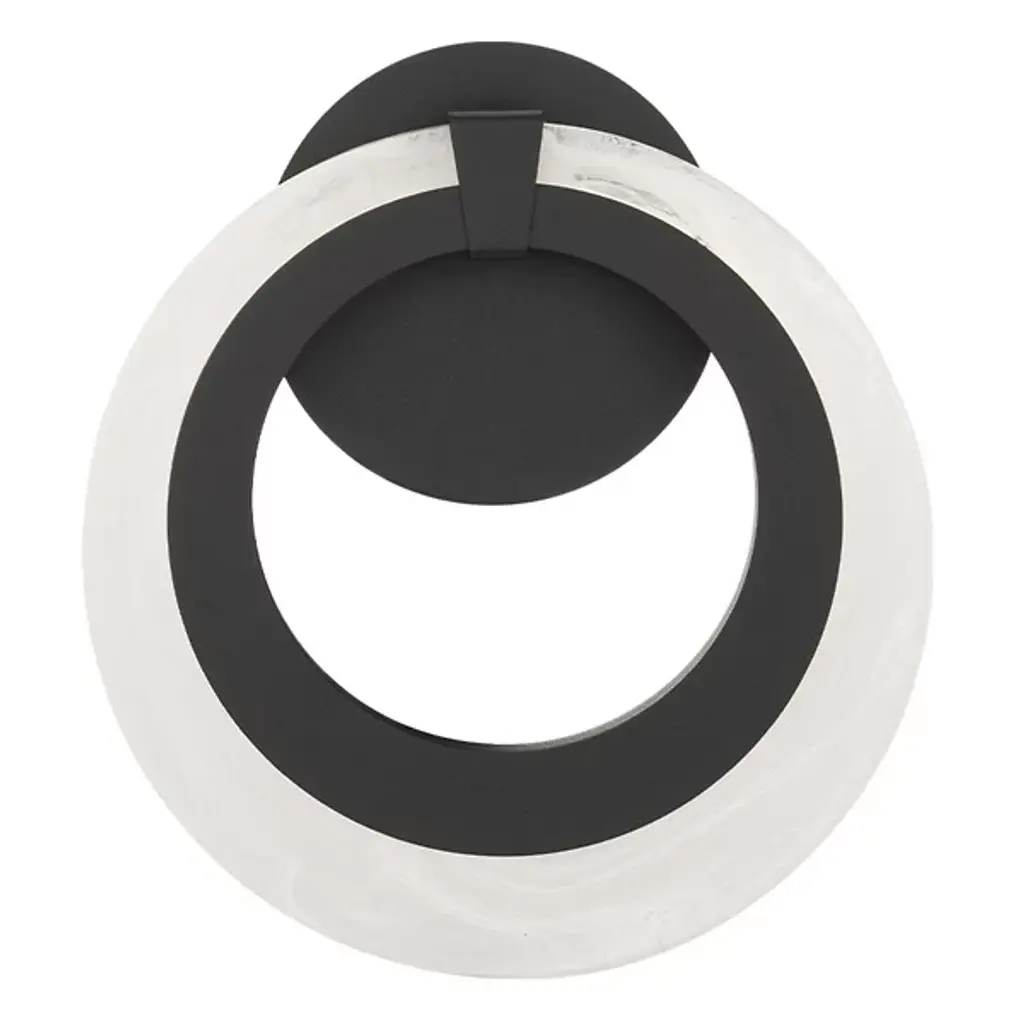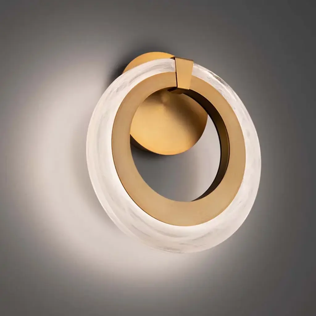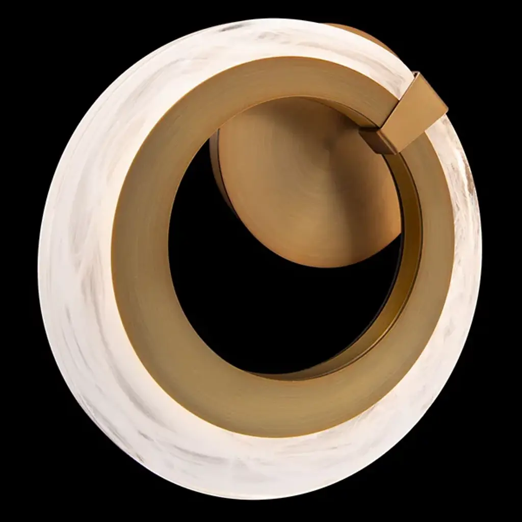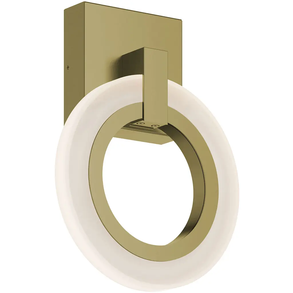 Add a stately, sculptural appeal to interior walls with the Serenity LED Wall Sconce from Modern Forms. A rounded, expressive design extending from a circular wall plate, it uses a small bracket to hold out a vertical metal hoop housing of robust aluminum. The damp-listed and ADA-compliant fixture hangs like an earring, while a glass diffuser with an artisanal, decorated surface obscures direct glare, sending out a wash of even ambient light around the fixture, glinting off the smooth metal structure.