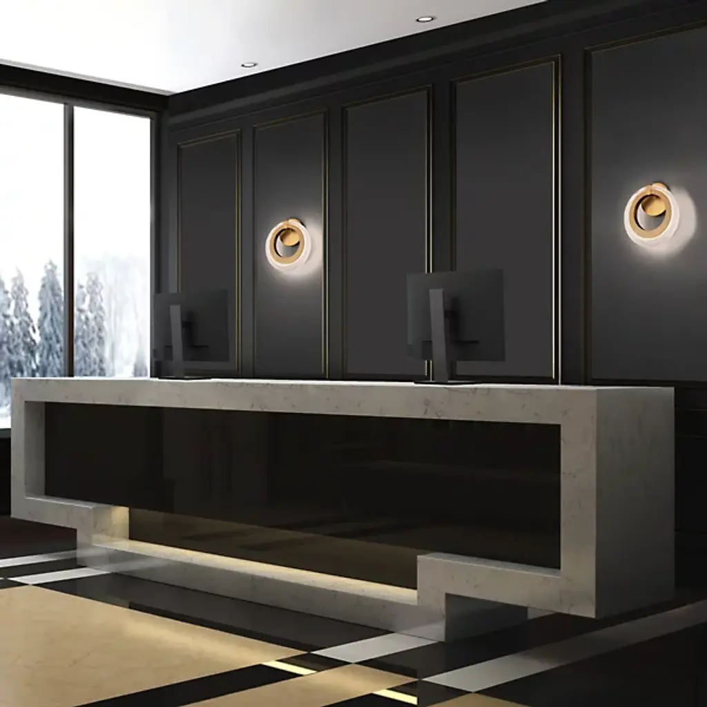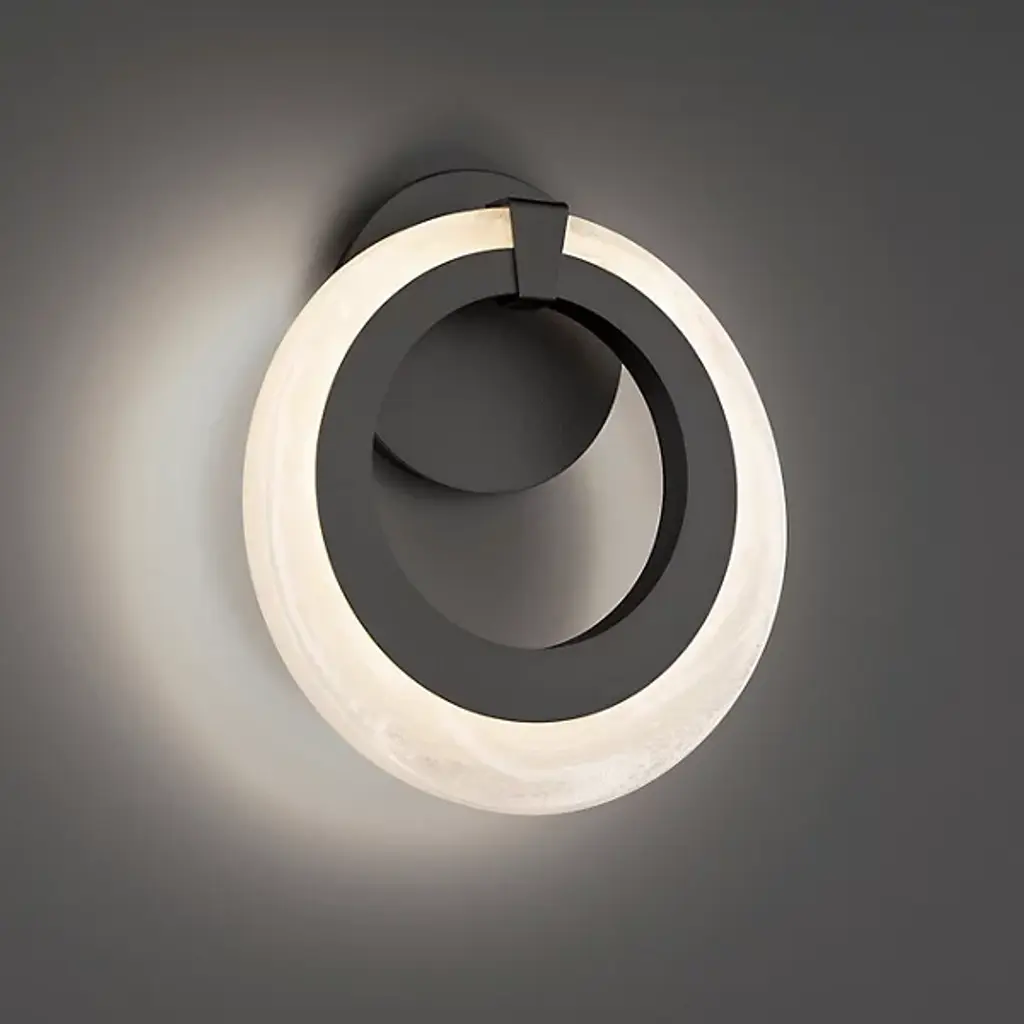 Add a stately, sculptural appeal to interior walls with the Serenity LED Wall Sconce from Modern Forms. A rounded, expressive design extending from a circular wall plate, it uses a small bracket to hold out a vertical metal hoop housing of robust aluminum. The damp-listed and ADA-compliant fixture hangs like an earring, while a glass diffuser with an artisanal, decorated surface obscures direct glare, sending out a wash of even ambient light around the fixture, glinting off the smooth metal structure.