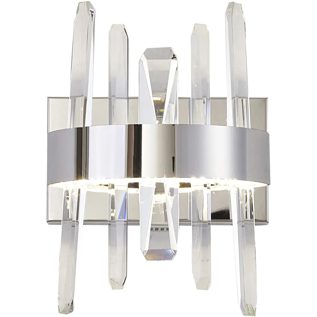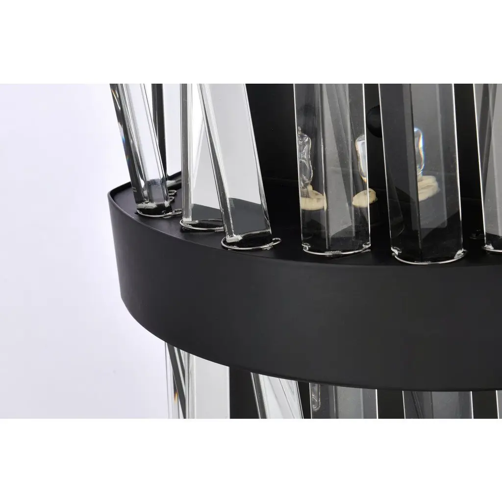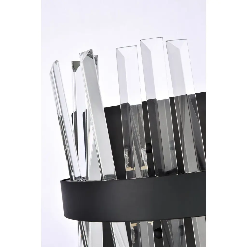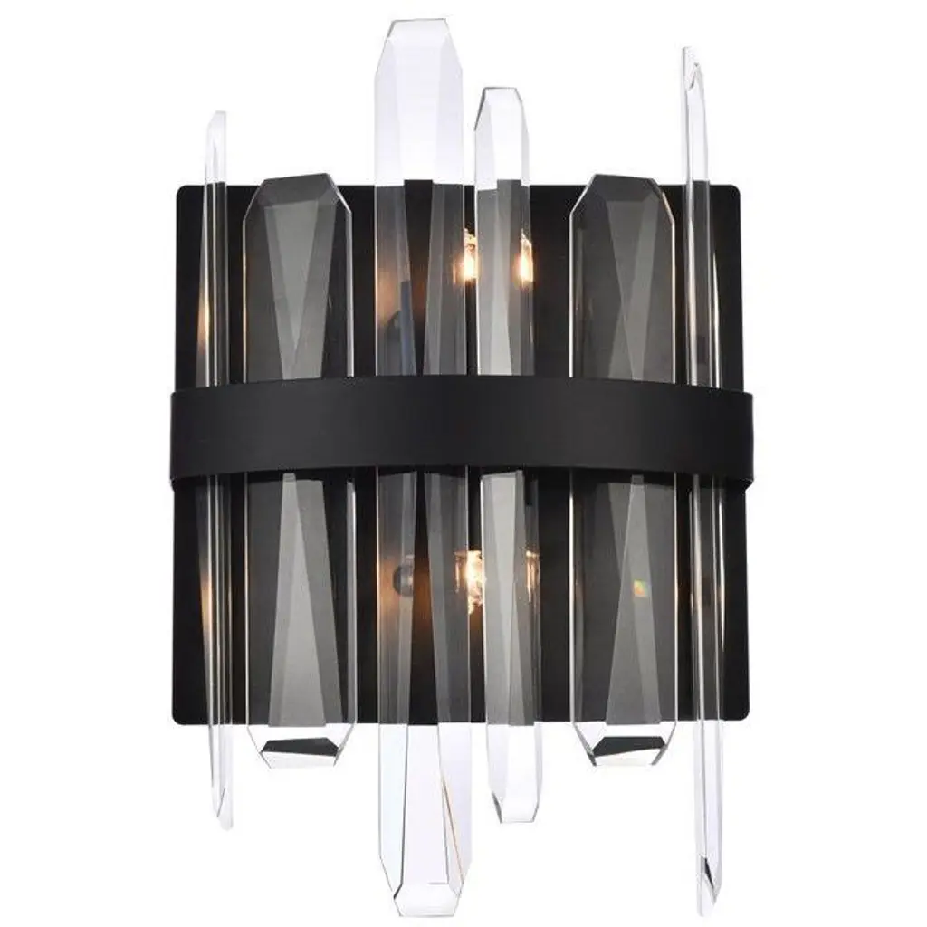 Modern crystal wall sconce features top and bottom tier crystal prisms staggered along a wrought iron frame. The thick metal frame wraps around top grade crystal prisms ensure it is built to last, definitely worth it. Mount this work of art and dim the lights for a bit of sophisticated lighting in your home. Get lost in a beautiful light and sleek design available in multiple finishes.