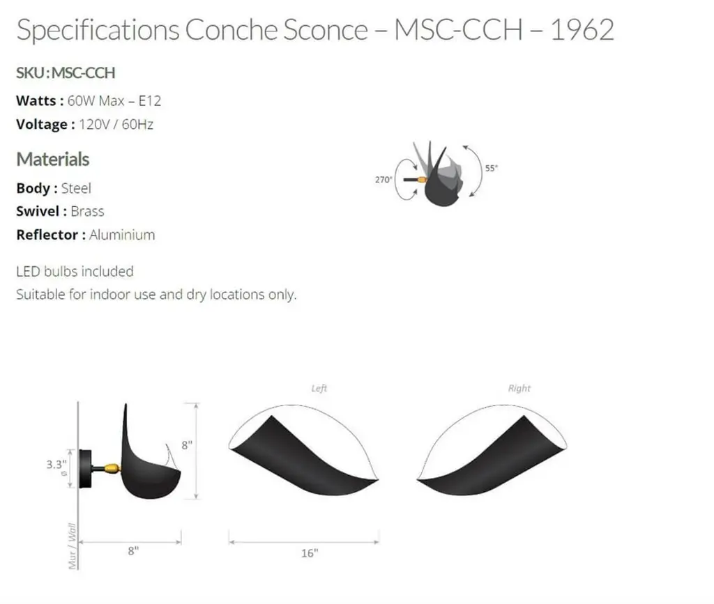Curved and fluid, simple in design, the Conche Sconce embodies the same qualities as its name sake. The lamp rests on a small stem which allows the shade to tilt and move to the ideal position for each application.Available in white or black - left or right.COLOR OPTIONAvailable in Black or WhiteFEATURES-CUSTOMIZATIONSWITCH OPTIONSOnly customization is with switch or without switchWHAT SETS US APART? - Technical expertise - Full line of products - Availability - Customization - 5 year guarantee - Secured shipment - Small Repairs - After sale service - Experience (we introduced these lamps to the US, 22 years ago).WHAT TO LOOK OUT FOR:International shipping is expensive, lengthy and somewhat risky, potentially a stressful experience - Expensive: Most Mouille lamps are shipped in very large boxes. Shipping costs are calculated based on the volume of the box, Add this to Customs duties, insurance and US entry fee, and the final price will be approximately 25% more than your final net price. - Lengthy: Your lamp should be shipped by plane which takes about 8 to 9 hours flying from Europe to New York. Transportation is still deeply affected by the pandemic’s disruptions. - Damages: Individual boxes traveling next to heavier bundled goods typical of int’l shipping are more prone to damages. HOW WE DO IT:No need to go through all this, we’ve done this part. The lamps are sold from NY, ready to ship to you for your peace of mind. We thoroughly inspect them with our 44 check points before shipping, which gives us the confidence to offer a 5-year guarantee to our clients.