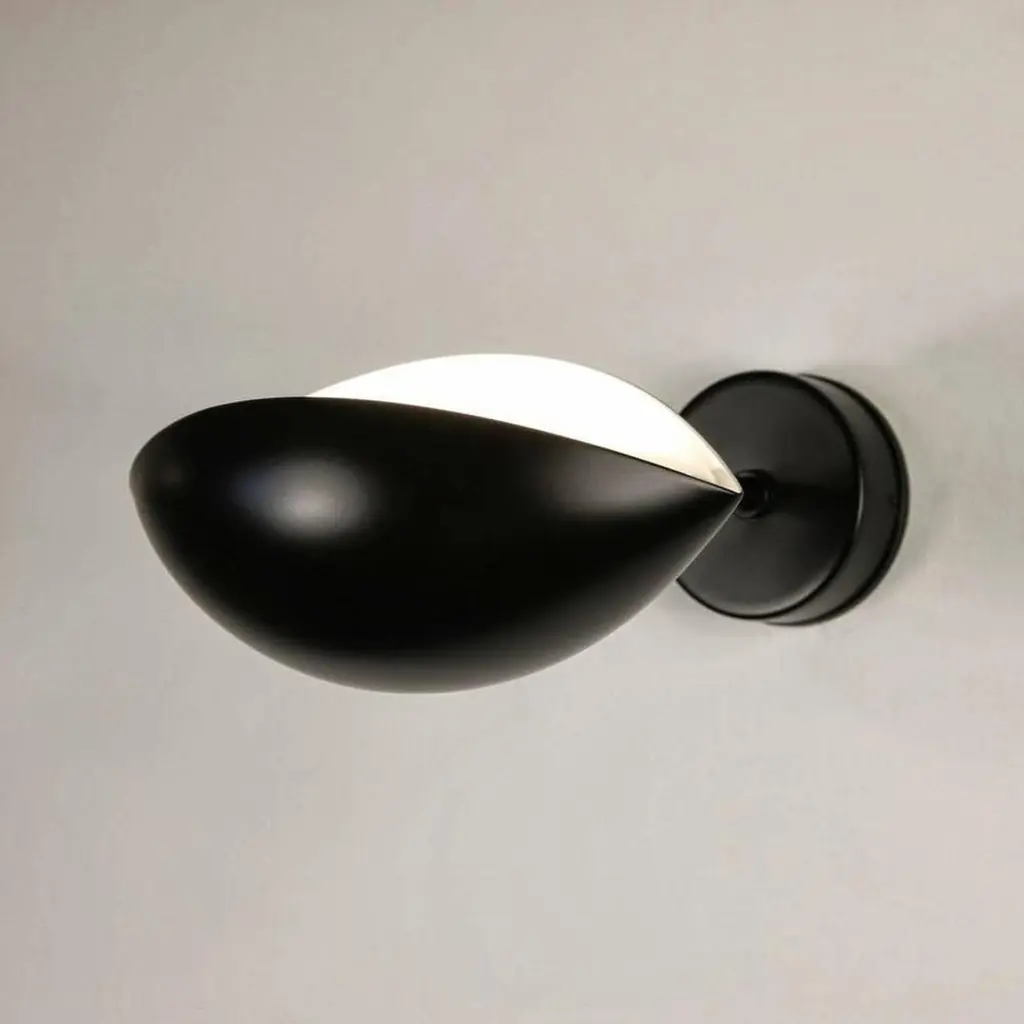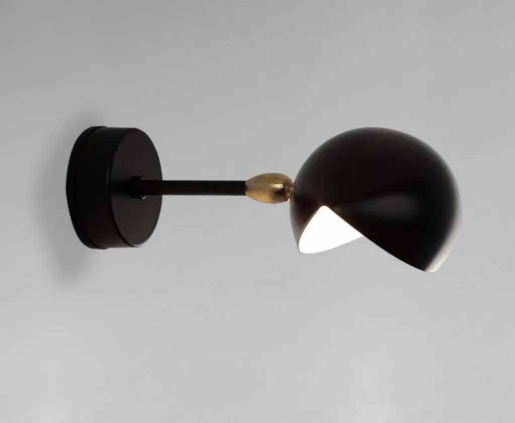 Sconce wall lamp model 'eye wall lamp' designed by Serge Mouille in 1956.Manufactured by Editions Serge Mouille in France. The production of lamps, wall lights and floor lamps are manufactured using craftsman’s techniques with the same materials and techniques as the first models.Each lamp has a personal serial number and a specific "Certificate of Authenticity" when delivered. Materials and color:body : steel swivel : brass reflector : aluminium.black lacquered - always glossy white inside the lamp shades.This model is also available in white.Dimensions:H 7.87 in. x W 10.23 in. x D 7.87 in.H 20 cm x W 26 cm x D 20 cmTechnical details:CE : 42W max - E27 - 230V - 50HzUS : 60W max - E26 - 120V - 60HzIndoor use and dry locations only.Serge Mouille (24 December 1922-1988) was a French Industrial designer and goldsmith. He is best known for his light fixture designs. After having worked a few years in the workshop of Gabriel Lacroix, he opened his own workshop in 1945 with the intention of creating silverware utensils.In 1953 he began researching and designing light fixtures. During this period he was also supervising the gold smithing department at l'École des Arts Appliqués. In 1955 he was inducted into the Société des Artistes Décorateurs ("the Interior Decorators' Society").The following year, Steph Simon opened a design gallery at 145 Bd St Germain in Paris. Displaying the work of Charlotte Perriand and Jean Prouvé, the gallery soon also featured the work of Serge Mouille, Isamu Noguchi and Jean Luce. The designs of these artists soon become more widely known thanks to orders placed by institutions such as, Cité universitaire d’Antony, University of Strasbourg, University of Aix-Marseille and Centre d’essais en vol de Brétigny. Serge Mouille suffered from tuberculosis for many years and in 1959 he was forced to suspend his design activities and undergo treatment. In 1961, thanks to the Société de Création des Modèles, he was able to exhibit his latest light fixture designs at the trade show Salon des arts ménagers. These designs combined the concepts of fluorescence and incandescence. Production of his light fixtures stopped definitively in 1961.Serge Mouille remains famous primarily for his Minimalistic designs and use of uniformly black painted metal materials. His wall-mounted spot light fixture with articulated arms is typical for his discrete, yet highly functional designs.