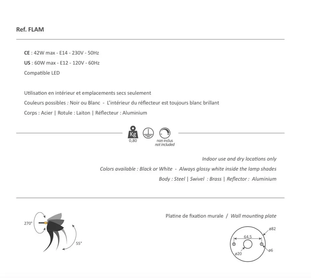 Wall lamp model 'Flame Wall Lamp' designed by Serge Mouille in 1962.Manufactured by Editions Serge Mouille in France. The production of lamps, wall lights and floor lamps are manufactured using craftsman’s techniques with the same materials and techniques as the first models.Each lamp has a personal serial number and a specific "Certificate of Authenticity" when delivered. The certificate shown on the photo is just an example.Materials and color:Body: Steel swivel: Brass reflector: AluminiumBlack lacquered, always glossy white inside the lamp shades Dimensions:H 11.81 in. x W 7.87 in. x D 9.84 in.H 30 cm x W 20 cm x D 25 cmTechnical details:CE: 42W max - E27 - 230V - 50HzUS: 60W max - E26 - 120V - 60HzIndoor use and dry locations only.Serge Mouille (24 December 1922-1988) was a French Industrial designer and goldsmith. He is best known for his light fixture designs. After having worked a few years in the workshop of Gabriel Lacroix, he opened his own workshop in 1945 with the intention of creating silverware utensils.In 1953 he began researching and designing light fixtures. During this period he was also supervising the gold smithing department at l'École des Arts Appliqués. In 1955 he was inducted into the Société des Artistes Décorateurs ("the Interior Decorators' Society").The following year, Steph Simon opened a design gallery at 145 Bd St Germain in Paris. Displaying the work of Charlotte Perriand and Jean Prouvé, the gallery soon also featured the work of Serge Mouille, Isamu Noguchi and Jean Luce. The designs of these artists soon become more widely known thanks to orders placed by institutions such as, Cité universitaire d’Antony, University of Strasbourg, University of Aix-Marseille and Centre d’essais en vol de Brétigny. Serge Mouille suffered from tuberculosis for many years and in 1959 he was forced to suspend his design activities and undergo treatment. In 1961, thanks to the Société de Création des Modèles, he was able to exhibit his latest light fixture designs at the trade show Salon des arts ménagers. These designs combined the concepts of fluorescence and incandescence. Production of his light fixtures stopped definitively in 1961.Serge Mouille remains famous primarily for his Minimalistic designs and use of uniformly black painted metal materials. His wall-mounted spot light fixture with articulated arms is typical for his discrete, yet highly functional designs.Current production delay is aprox. 45 - 48 weeks