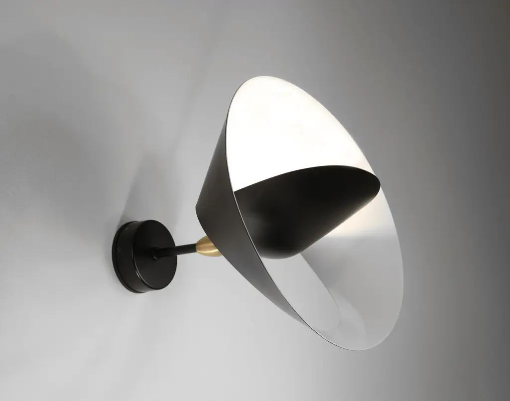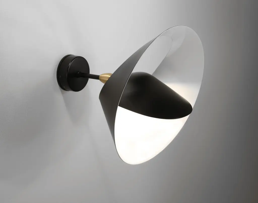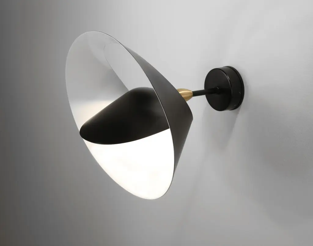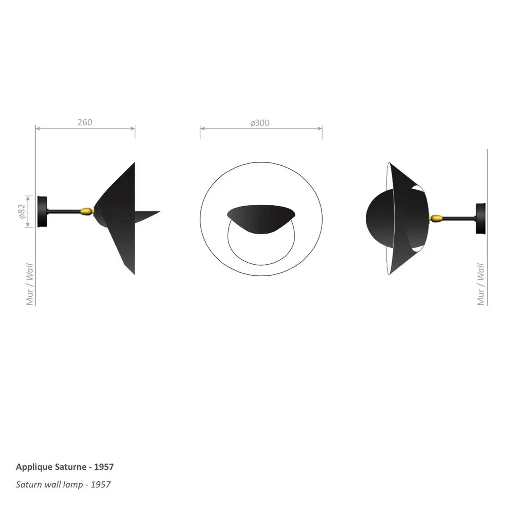 Sconce wall lamp model 'Saturn Wall Lamp' designed by Serge Mouille in 1957.Manufactured by Editions Serge Mouille in France. The production of lamps, wall lights and floor lamps are manufactured using craftsman’s techniques with the same materials and techniques as the first models.Each lamp has a personal serial number and a specific “Certificate of Authenticity” when delivered. Materials and color:Body: Steel swivel: Brass reflector: AluminiumBlack lacquered - always glossy white inside the lamp shadesThis model is also available in white.Dimensions:H 11.81 in. x W 11.81 in. x D 10.23 in.H 30 cm x W 30 cm x D 26 cmTechnical details:CE: 42W max - E27 - 230V - 50HzUS: 60W max - E26 - 120V - 60HzIndoor use and dry locations only.Serge Mouille (24 December 1922-1988) was a French Industrial designer and goldsmith. He is best known for his light fixture designs. After having worked a few years in the workshop of Gabriel Lacroix, he opened his own workshop in 1945 with the intention of creating silverware utensils.In 1953 he began researching and designing light fixtures. During this period he was also supervising the gold smithing department at l'École des Arts Appliqués. In 1955 he was inducted into the Société des Artistes Décorateurs ("the Interior Decorators' Society").The following year, Steph Simon opened a design gallery at 145 Bd St Germain in Paris. Displaying the work of Charlotte Perriand and Jean Prouvé, the gallery soon also featured the work of Serge Mouille, Isamu Noguchi and Jean Luce. The designs of these artists soon become more widely known thanks to orders placed by institutions such as, Cité universitaire d’Antony, University of Strasbourg, University of Aix-Marseille and Centre d’essais en vol de Brétigny. Serge Mouille suffered from tuberculosis for many years and in 1959 he was forced to suspend his design activities and undergo treatment. In 1961, thanks to the Société de Création des Modèles, he was able to exhibit his latest light fixture designs at the trade show Salon des arts ménagers. These designs combined the concepts of fluorescence and incandescence. Production of his light fixtures stopped definitively in 1961.Serge Mouille remains famous primarily for his Minimalistic designs and use of uniformly black painted metal materials. His wall-mounted spot light fixture with articulated arms is typical for his discrete, yet highly functional designs.