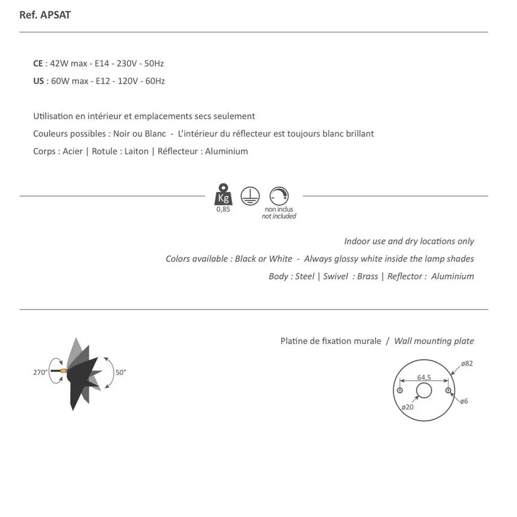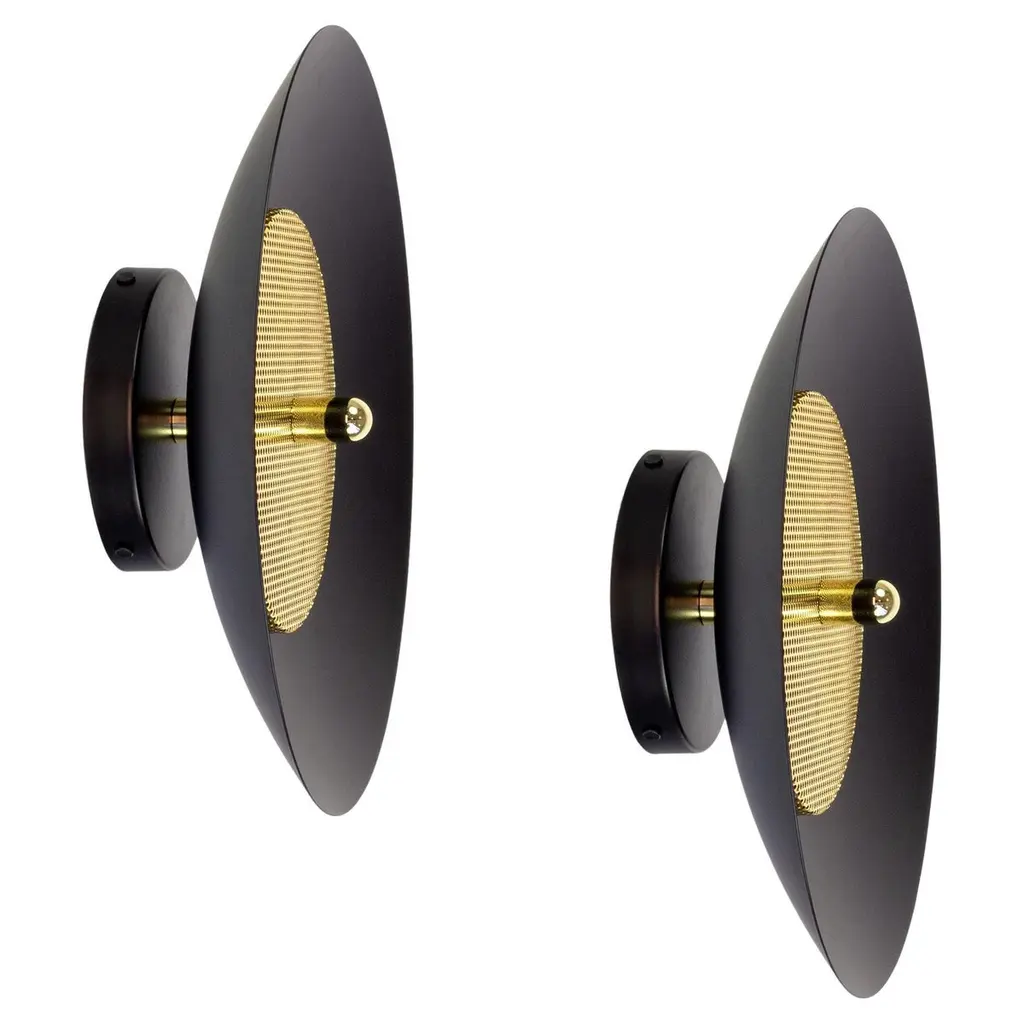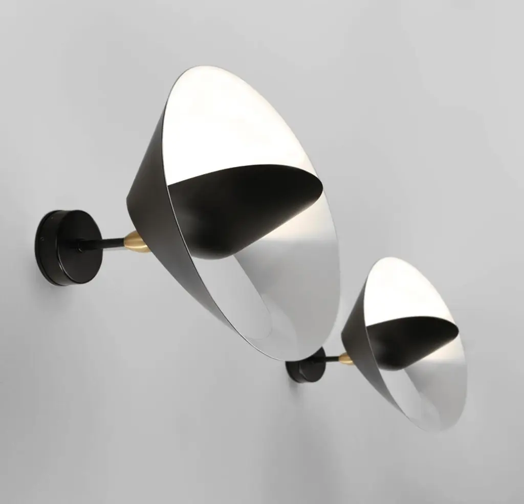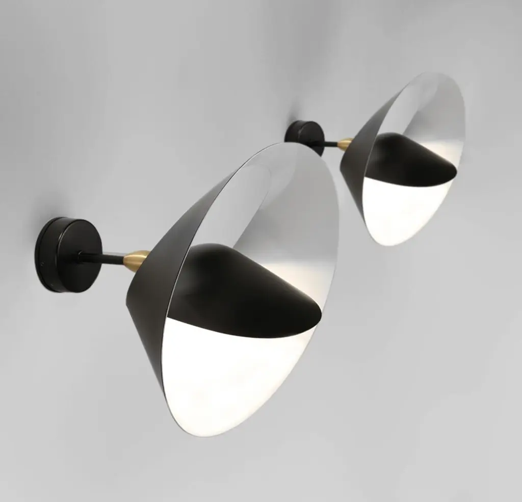 Sconce wall lamp model 'Saturn Wall Lamp' designed by Serge Mouille in 1957.Manufactured by Editions Serge Mouille in France. The production of lamps, wall lights and floor lamps are manufactured using craftsman’s techniques with the same materials and techniques as the first models.Each lamp has a personal serial number and a specific certificate of authenticity when delivered. The certificate shown on the photo is just an example.Materials and color:Body: Steel swivel : Brass reflector: AluminiumBlack lacquered - Always glossy white inside the lamp shadesThis model is also available in white.Dimensions:H 11.81 in. x W 11.81 in. x D 10.23 in.H 30 cm x W 30 cm x D 26 cmTechnical details:CE: 42W max - E27 - 230V - 50HzUS: 60W max - E26 - 120V - 60HzIndoor use and dry locations only.Serge Mouille (24 December 1922-1988) was a French Industrial designer and goldsmith. He is best known for his light fixture designs. After having worked a few years in the workshop of Gabriel Lacroix, he opened his own workshop in 1945 with the intention of creating silverware utensils.In 1953 he began researching and designing light fixtures. During this period he was also supervising the gold smithing department at l'École des Arts Appliqués. In 1955 he was inducted into the Société des Artistes Décorateurs ("the Interior Decorators' Society").The following year, Steph Simon opened a design gallery at 145 Bd St Germain in Paris. Displaying the work of Charlotte Perriand and Jean Prouvé, the gallery soon also featured the work of Serge Mouille, Isamu Noguchi and Jean Luce. The designs of these artists soon become more widely known thanks to orders placed by institutions such as, Cité universitaire d’Antony, University of Strasbourg, University of Aix-Marseille and Centre d’essais en vol de Brétigny. Serge Mouille suffered from tuberculosis for many years and in 1959 he was forced to suspend his design activities and undergo treatment. In 1961, thanks to the Société de Création des Modèles, he was able to exhibit his latest light fixture designs at the trade show Salon des arts ménagers. These designs combined the concepts of fluorescence and incandescence. Production of his light fixtures stopped definitively in 1961.Serge Mouille remains famous primarily for his Minimalistic designs and use of uniformly black painted metal materials. His wall-mounted spot light fixture with articulated arms is typical for his discrete, yet highly functional designs.