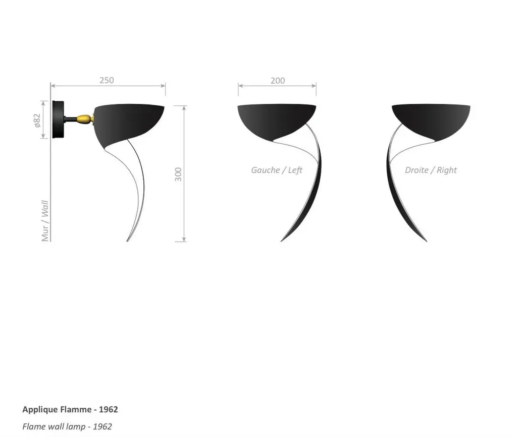 Wall lamp model 'Flame Wall Lamp' designed by Serge Mouille in 1962.Manufactured by Editions Serge Mouille in France. The production of lamps, wall lights and floor lamps are manufactured using craftsman’s techniques with the same materials and techniques as the first models.Each lamp has a personal serial number and a specific "Certificate of Authenticity" when delivered. Materials and color:Body: Steel swivel: Brass reflector: AluminiumWhite lacquered - Always glossy white inside the lamp shadesThe picture is a digital preview, colors may vary.This model is also available in black.Dimensions:H 11.81 in. x W 7.87 in. x D 9.84 in.H 30 cm x W 20 cm x D 25 cmTechnical details:CE : 42W max - E27 - 230V - 50HzUS : 60W max - E26 - 120V - 60HzIndoor use and dry locations only.Serge Mouille (24 December 1922-1988) was a French Industrial designer and goldsmith. He is best known for his light fixture designs. After having worked a few years in the workshop of Gabriel Lacroix, he opened his own workshop in 1945 with the intention of creating silverware utensils.In 1953 he began researching and designing light fixtures. During this period he was also supervising the gold smithing department at l'École des Arts Appliqués. In 1955 he was inducted into the Société des Artistes Décorateurs ("the Interior Decorators' Society").The following year, Steph Simon opened a design gallery at 145 Bd St Germain in Paris. Displaying the work of Charlotte Perriand and Jean Prouvé, the gallery soon also featured the work of Serge Mouille, Isamu Noguchi and Jean Luce. The designs of these artists soon become more widely known thanks to orders placed by institutions such as, Cité universitaire d’Antony, University of Strasbourg, University of Aix-Marseille and Centre d’essais en vol de Brétigny. Serge Mouille suffered from tuberculosis for many years and in 1959 he was forced to suspend his design activities and undergo treatment. In 1961, thanks to the Société de Création des Modèles, he was able to exhibit his latest light fixture designs at the trade show Salon des arts ménagers. These designs combined the concepts of fluorescence and incandescence. Production of his light fixtures stopped definitively in 1961.Serge Mouille remains famous primarily for his Minimalistic designs and use of uniformly black painted metal materials. His wall-mounted spot light fixture with articulated arms is typical for his discrete, yet highly functional designs.