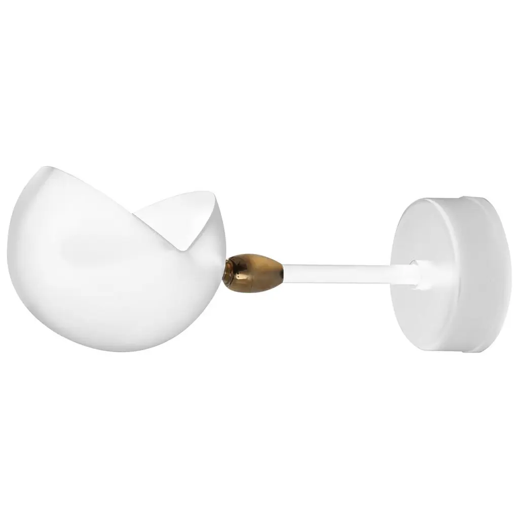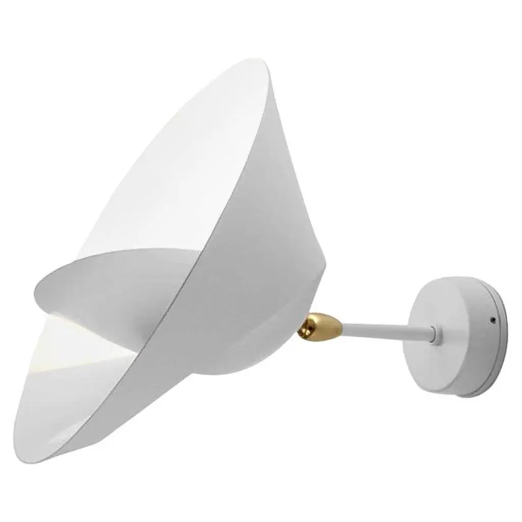 Sconce wall lamp model 'Saturn Wall Lamp' designed by Serge Mouille in 1957.Manufactured by Editions Serge Mouille in France. The production of lamps, wall lights and floor lamps are manufactured using craftsman’s techniques with the same materials and techniques as the first models.Each lamp has a personal serial number and a specific certificate of authenticity when delivered. Materials and color:Body : Steel Swivel : Brass Reflector : AluminiumWhite Lacquered - Always glossy white inside the lamp shadesThis model is also available in black.Dimensions:H 11.81 in. x W 11.81 in. x D 10.23 in.H 30 cm x W 30 cm x D 26 cmTechnical details:CE : 42W max - E27 - 230V - 50HzUS : 60W max - E26 - 120V - 60HzIndoor use and dry locations only.Serge Mouille (24 December 1922-1988) was a French Industrial designer and goldsmith. He is best known for his light fixture designs. After having worked a few years in the workshop of Gabriel Lacroix, he opened his own workshop in 1945 with the intention of creating silverware utensils.In 1953 he began researching and designing light fixtures. During this period he was also supervising the gold smithing department at l'École des Arts Appliqués. In 1955 he was inducted into the Société des Artistes Décorateurs ("the Interior Decorators' Society").The following year, Steph Simon opened a design gallery at 145 Bd St Germain in Paris. Displaying the work of Charlotte Perriand and Jean Prouvé, the gallery soon also featured the work of Serge Mouille, Isamu Noguchi and Jean Luce. The designs of these artists soon become more widely known thanks to orders placed by institutions such as, Cité universitaire d’Antony, University of Strasbourg, University of Aix-Marseille and Centre d’essais en vol de Brétigny. Serge Mouille suffered from tuberculosis for many years and in 1959 he was forced to suspend his design activities and undergo treatment. In 1961, thanks to the Société de Création des Modèles, he was able to exhibit his latest light fixture designs at the trade show Salon des arts ménagers. These designs combined the concepts of fluorescence and incandescence. Production of his light fixtures stopped definitively in 1961.Serge Mouille remains famous primarily for his Minimalistic designs and use of uniformly black painted metal materials. His wall-mounted spot light fixture with articulated arms is typical for his discrete, yet highly functional designs.