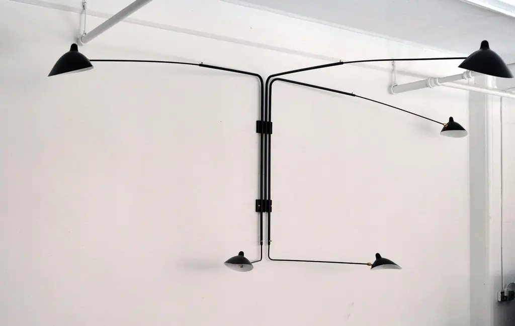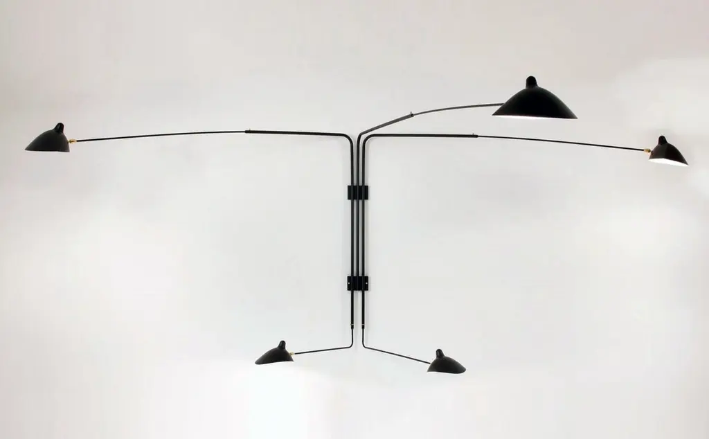 A larger sconce with two identical long arms and three shorter arms of varying lengths, this lamp can illuminate a large area of a wall or room. Each lamp head rotates and tilts.Available in white or black with brass fittings.COLOR OPTIONAvailable in Black or WhiteFEATURES3 Upper arms and 2 lower arms independently rotate from wall to wall without ever touching it, however the 3 upper arms rotate on the same plan. Same goes with the 2 lower arms. Arms are not telescopic, the upper thinner arms do not slide in the upper thicker arms. This lamp will be the center of attention.3 "Chapeau" (Hat) shades on top and 2 "Casquette" (Cap) shade rotate and swivel.CUSTOMIZATIONCustomization possible for the dimension between the upper and lower arms as well as for arm's lengths. Arm length = from wall to the tip of the shade.SWITCH OPTIONSThe Rotating Wall Fixture with 5 Arms is hardwired. The light bulbs can be controled together from the wall switch or independently with 2 switches (1 for the 3 upper arms, 1 for the 2 lower arms) installed on the mounting plate.Best fit dimmable LED bulbs providedWHAT SETS US APART? - Technical expertise - Full line of products - Availability - Customization - 5 year guarantee - Secured shipment - Small Repairs - After sale service - Experience (we introduced these lamps to the US, 22 years ago).WHAT TO LOOK OUT FOR:International shipping is expensive, lengthy and somewhat risky, potentially a stressful experience - Expensive: Most Mouille lamps are shipped in very large boxes. Shipping costs are calculated based on the volume of the box, Add this to Customs duties, insurance and US entry fee, and the final price will be approximately 25% more than your final net price. - Lengthy: Your lamp should be shipped by plane which takes about 8 to 9 hours flying from Europe to New York. Transportation is still deeply affected by the pandemic’s disruptions. - Damages: Individual boxes traveling next to heavier bundled goods typical of int’l shipping are more prone to damages. HOW WE DO IT:No need to go through all this, we’ve done this part. The lamps are sold from NY, ready to ship to you for your peace of mind. We thoroughly inspect them with our 44 check points before shipping, which gives us the confidence to offer a 5-year guarantee to our clients.