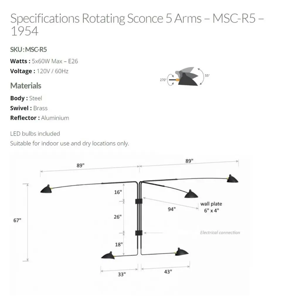 A larger sconce with two identical long arms and three shorter arms of varying lengths, this lamp can illuminate a large area of a wall or room. Each lamp head rotates and tilts.Available in white or black with brass fittings.COLOR OPTIONAvailable in Black or WhiteFEATURES3 Upper arms and 2 lower arms independently rotate from wall to wall without ever touching it, however the 3 upper arms rotate on the same plan. Same goes with the 2 lower arms. Arms are not telescopic, the upper thinner arms do not slide in the upper thicker arms. This lamp will be the center of attention.3 "Chapeau" (Hat) shades on top and 2 "Casquette" (Cap) shade rotate and swivel.CUSTOMIZATIONCustomization possible for the dimension between the upper and lower arms as well as for arm's lengths. Arm length = from wall to the tip of the shade.SWITCH OPTIONSThe Rotating Wall Fixture with 5 Arms is hardwired. The light bulbs can be controled together from the wall switch or independently with 2 switches (1 for the 3 upper arms, 1 for the 2 lower arms) installed on the mounting plate.Best fit dimmable LED bulbs providedWHAT SETS US APART? - Technical expertise - Full line of products - Availability - Customization - 5 year guarantee - Secured shipment - Small Repairs - After sale service - Experience (we introduced these lamps to the US, 22 years ago).WHAT TO LOOK OUT FOR:International shipping is expensive, lengthy and somewhat risky, potentially a stressful experience - Expensive: Most Mouille lamps are shipped in very large boxes. Shipping costs are calculated based on the volume of the box, Add this to Customs duties, insurance and US entry fee, and the final price will be approximately 25% more than your final net price. - Lengthy: Your lamp should be shipped by plane which takes about 8 to 9 hours flying from Europe to New York. Transportation is still deeply affected by the pandemic’s disruptions. - Damages: Individual boxes traveling next to heavier bundled goods typical of int’l shipping are more prone to damages. HOW WE DO IT:No need to go through all this, we’ve done this part. The lamps are sold from NY, ready to ship to you for your peace of mind. We thoroughly inspect them with our 44 check points before shipping, which gives us the confidence to offer a 5-year guarantee to our clients.