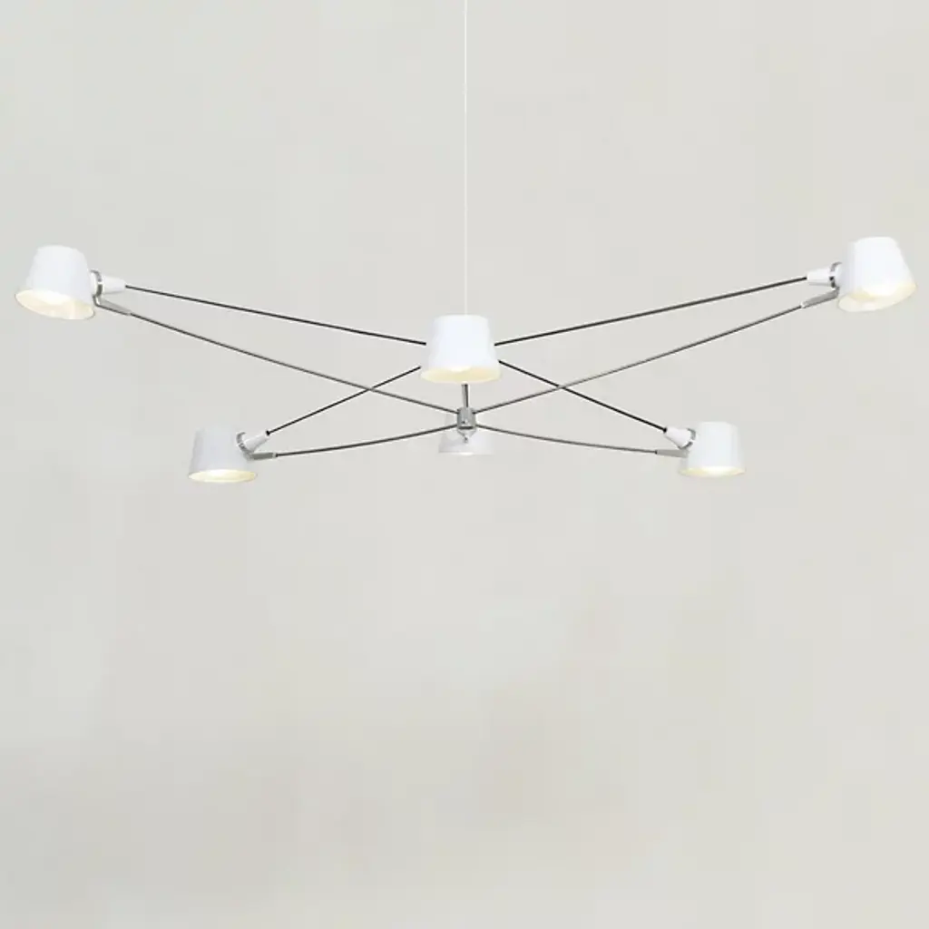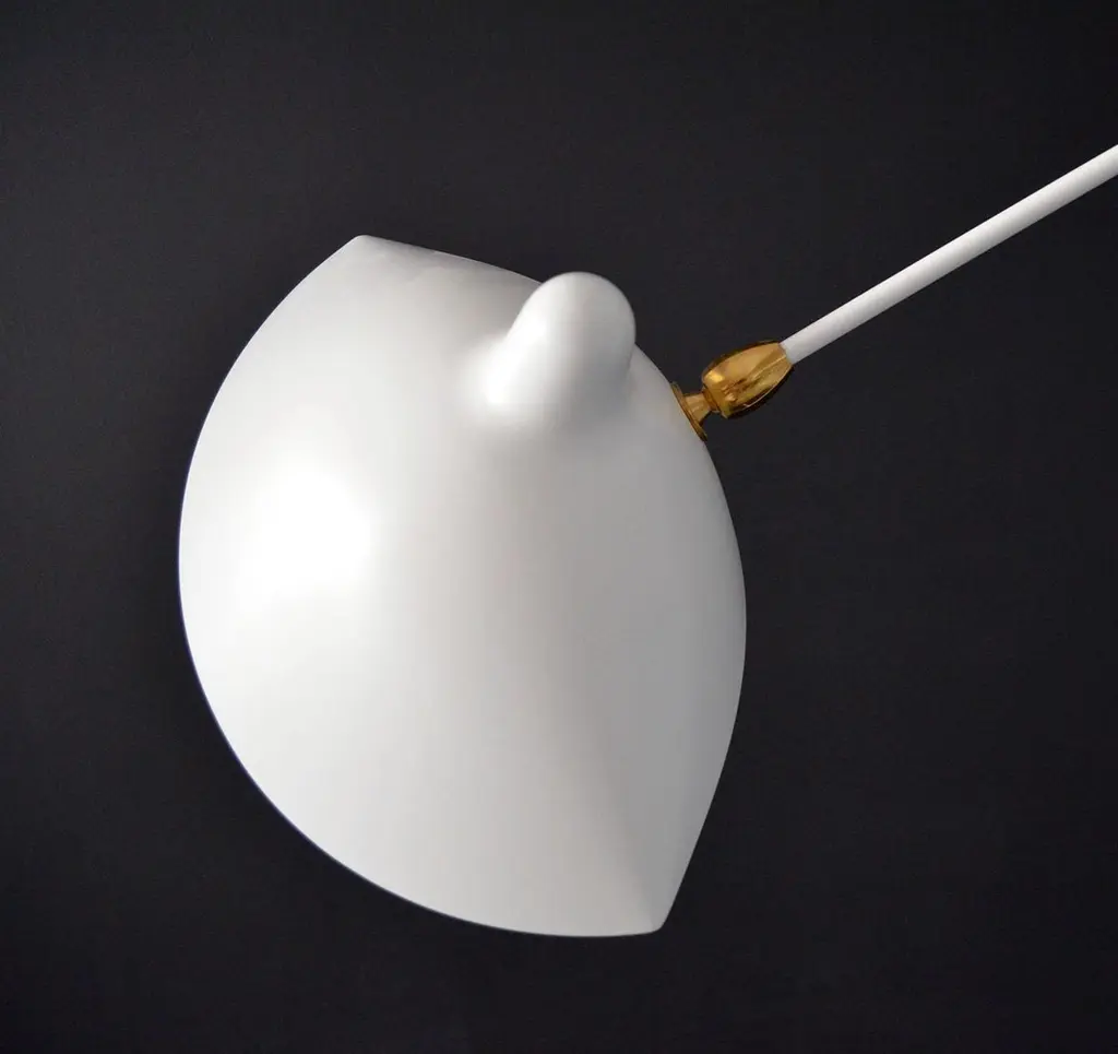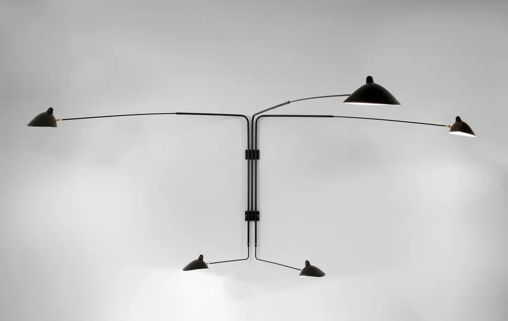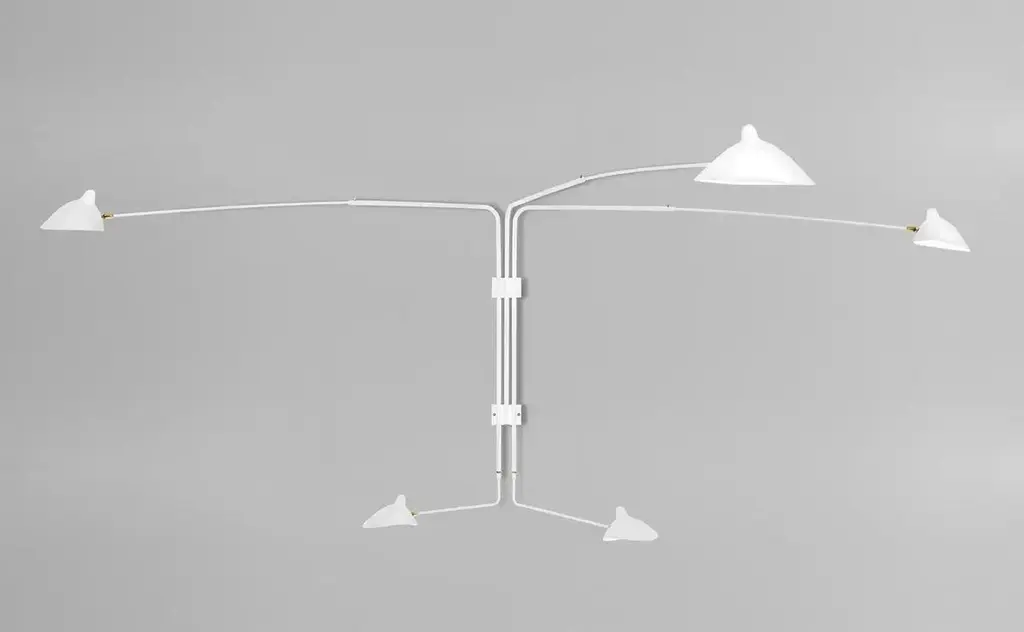 A larger sconce with two identical long arms and three shorter arms of varying lengths, this lamp can illuminate a large area of a wall or room. Each lamp head rotates and tilts.Available in white or black with brass fittings.COLOR OPTIONAvailable in Black or WhiteFEATURES3 Upper arms and 2 lower arms independently rotate from wall to wall without ever touching it, however the 3 upper arms rotate on the same plan. Same goes with the 2 lower arms. Arms are not telescopic, the upper thinner arms do not slide in the upper thicker arms. This lamp will be the center of attention.3 "Chapeau" (Hat) shades on top and 2 "Casquette" (Cap) shade rotate and swivel.CUSTOMIZATIONCustomization possible for the dimension between the upper and lower arms as well as for arm's lengths. Arm length = from wall to the tip of the shade.SWITCH OPTIONSThe Rotating Wall Fixture with 5 Arms is hardwired. The light bulbs can be controled together from the wall switch or independently with 2 switches (1 for the 3 upper arms, 1 for the 2 lower arms) installed on the mounting plate.Best fit dimmable LED bulbs providedWHAT SETS US APART? - Technical expertise - Full line of products - Availability - Customization - 5 year guarantee - Secured shipment - Small Repairs - After sale service - Experience (we introduced these lamps to the US, 23 years ago).WHAT TO LOOK OUT FOR:- No expensive international shipping, - No Customs fee- No deadlineAll lamps have been thoroughly inspected with our 44 check points upon arrival, which gives us the confidence to offer a 5-year guarantee to our clients.