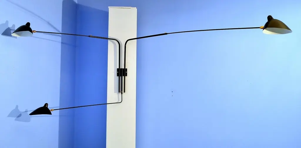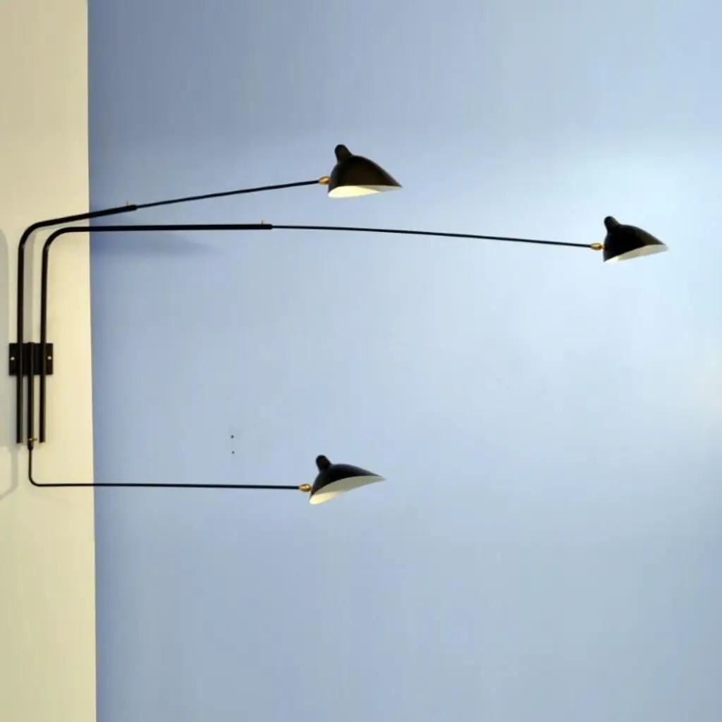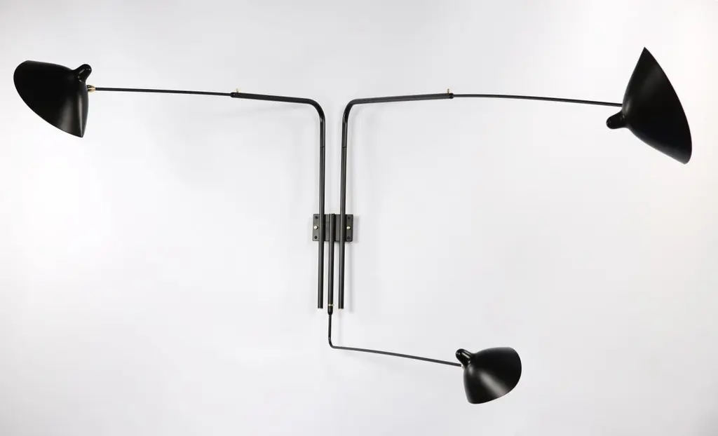 With arms measuring 52, 58 and 88 inches, this sconce can project light into a room at varying angles due to the independent rotation of each arm and each shade. Switches located on mounting plate. 32” H.The entire collection of licensed Serge Mouille lighting editions is available in the US exclusively through Gueridon.Available in white or black.